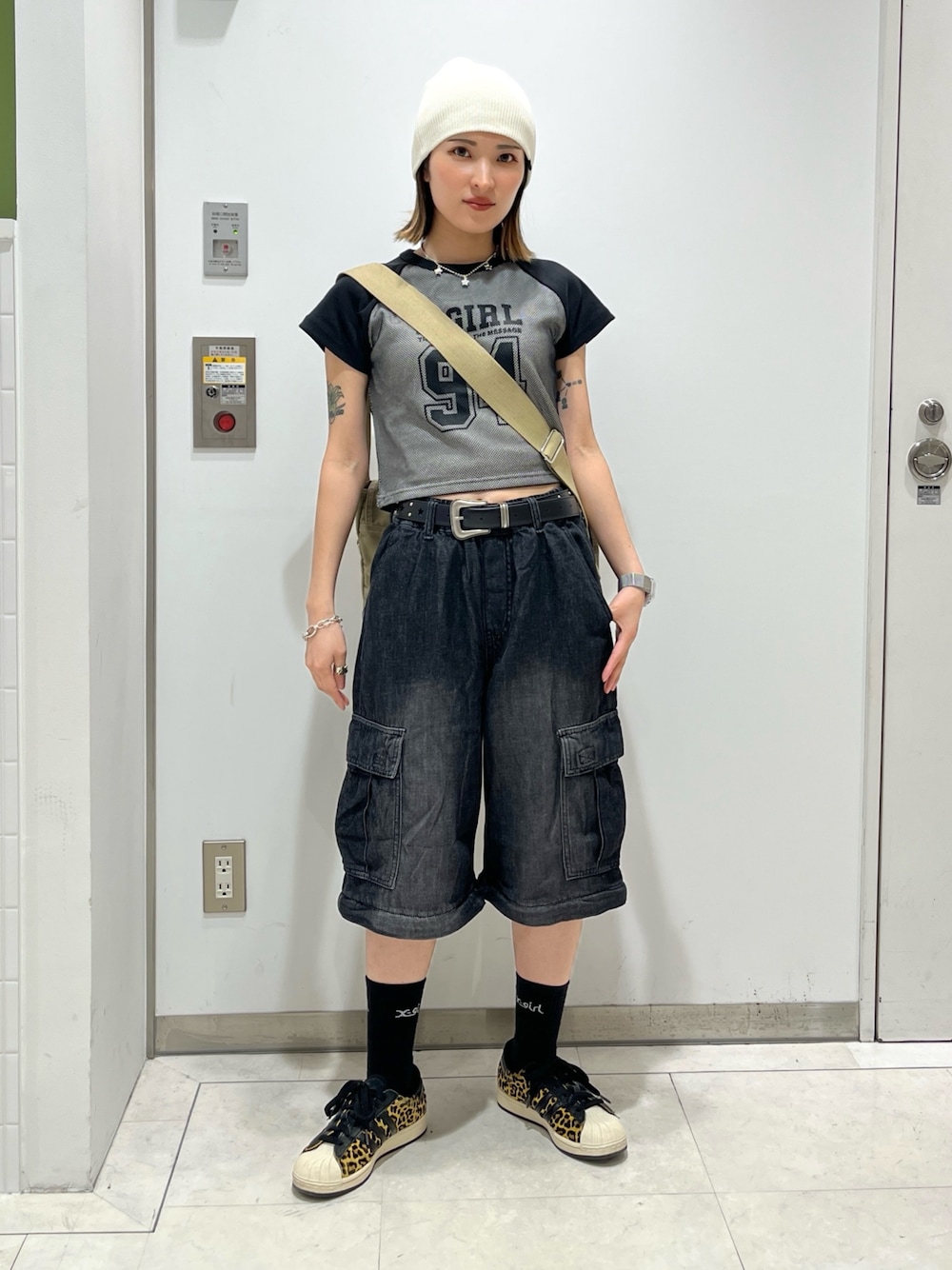 【155cm・骨格ウェーブ】 普段着用サイズ ・トップスS ・ボトムスXS,S ■TOPS Sサイズ着用 tシャツの上にメッシュがレイヤードされた二重構造のベイビーtシャツ。メッシュ透け感が夏らしく、変わり映えする一枚です!若干生地しっかりめな印象なので、普段のtシャツよりもタイトにかんじました! ■BOTTOMS Sサイズ着用 2WAY仕様でハーフパンツにもなるカーゴパンツ。ウエストゴムで密着感が無い分、ある程度気温が高い時期でも楽に涼しく着られます! 裾にドローコード付いてるので丈感も調節可。 ※こちらに在庫が無い場合、店舗に在庫があれば通販にてご自宅にお届け可能です!お手紙と一緒にお届け致しますので、インスタグラムのDMからでもご連絡お待ちしております! Instagram @rinthehood XG広島 082-207-3327