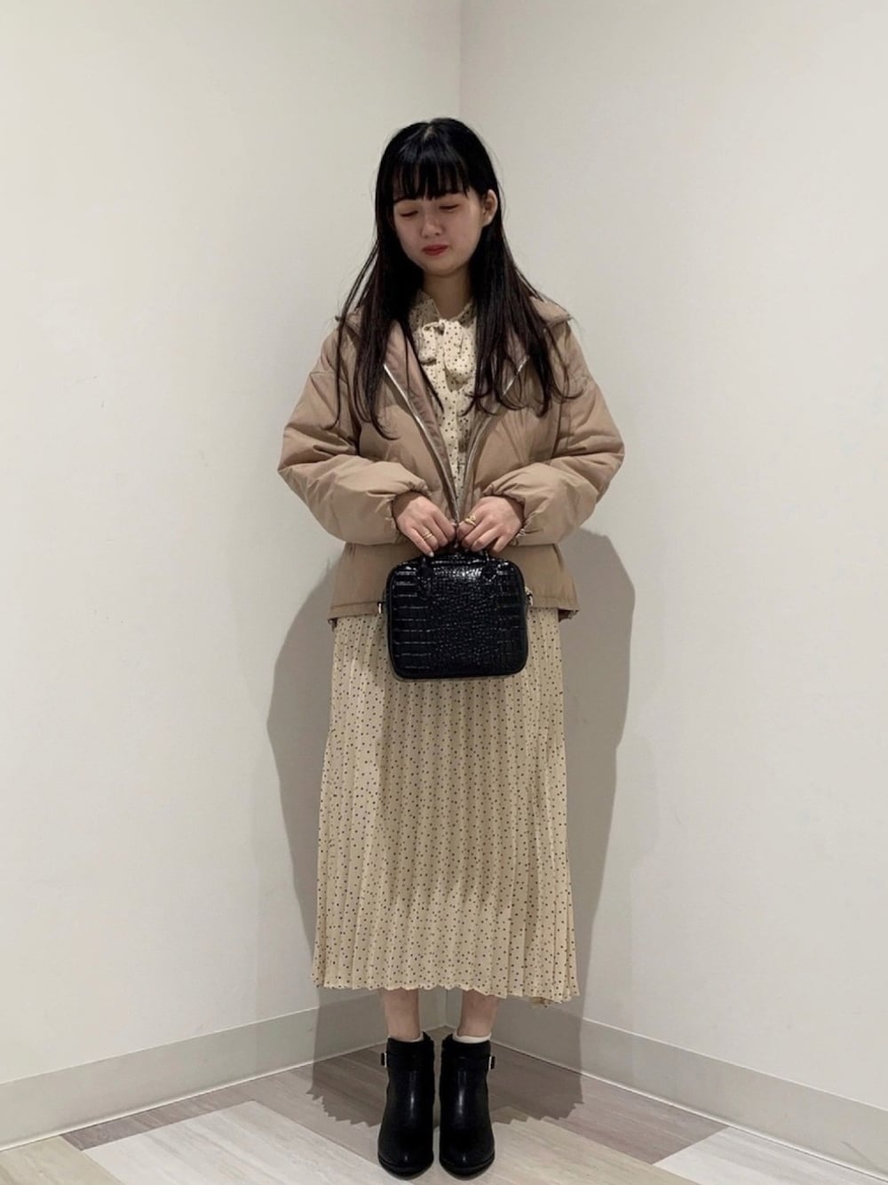 レトロなドットワンピースにピンクのダウンでガーリーコーデ🍓 ダウンとっても軽くて暖かいですよ~~~🙋♀️