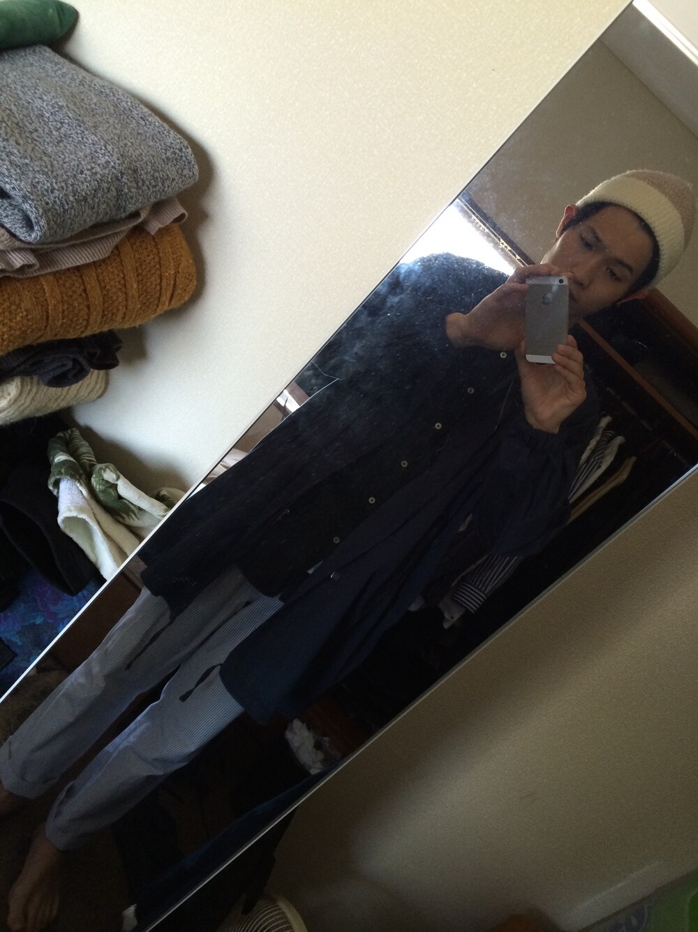 ノーカラーコート:バシスブルック シャツ:エンジニアード・ガーメンツ パンツ:不明 ニット帽:不明 シャツもノーカラーなんですが、ノーカラーは個人的に大好きです。