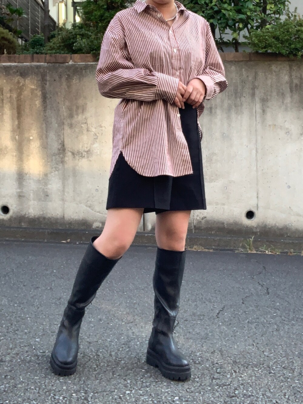 ストライプシャツとミニ丈ボトム、ロングブーツ合いすぎ可愛すぎ🤎