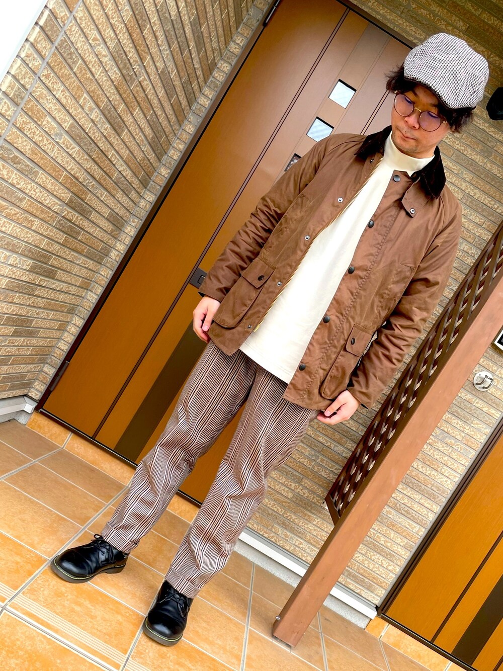 今日の一枚。 barbour着回しやすいし、着やすい。 帽子とパンツのチェックが同じ感じだったから、サンドウィッチにしてみた!