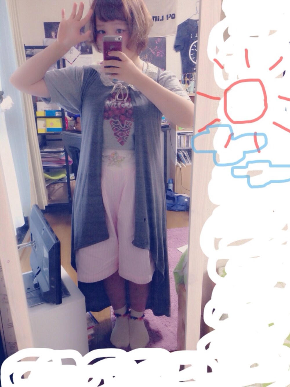 上に着てるのはフラミンゴのリメイクのやつです 。 着方に迷ったけどわたしが着るとどうしてもパジャマっぽくなっちゃう 。笑 それに 寒かったから実際はこれ着ないでパーカー着て出かけてます 。水色 。