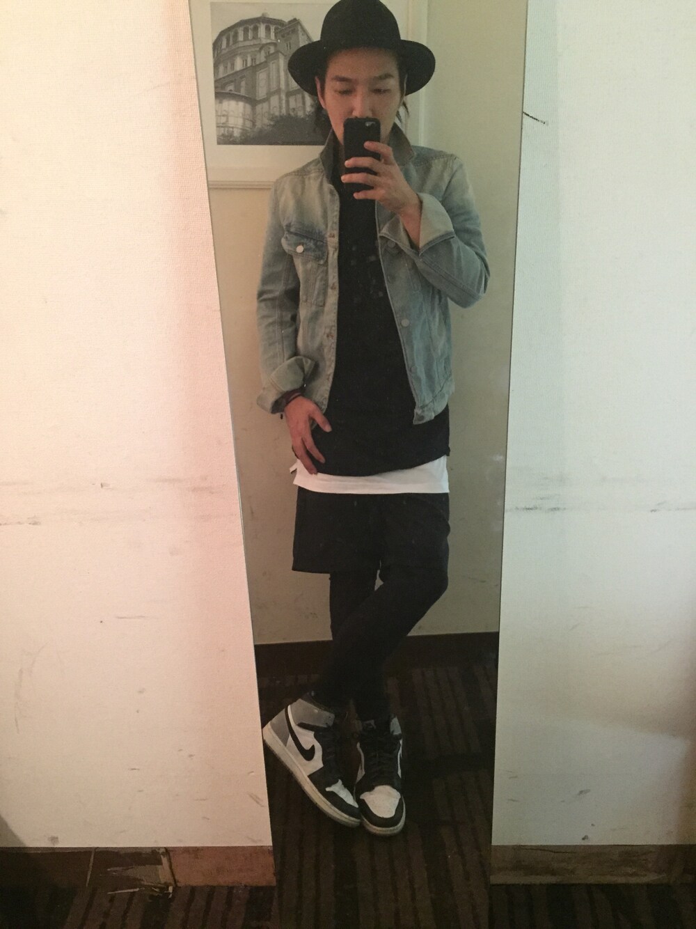 今日は久々にAJ1を履きたい気分だったので、AJ1のBaronsをベースにコーディネート。 KTZの同色プリントのTシャツにH&MのサイドジップTシャツをレイヤードして、ショーツは夏にヘビロテしたSupremeのショーパンにアメアパのレギンスで防寒対策。 アウターは使い勝手のよいBALMAINのデニムジャケット。 最近ハットばっかりw