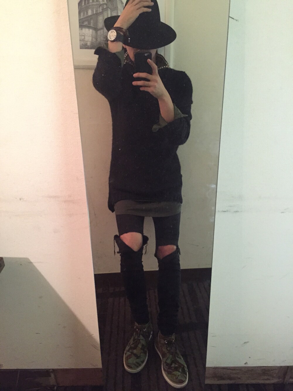 今日は先日のH&Mのサイドジップタートルネックニットの着まわしコーディネート。 ZAC VARGASのデッドストックのリメイクミリタリーシャツにH&Mのカーキのロング丈のTシャツを中にレイヤードして、足元はJimmy Chooのカモフラでブラック&カーキの2トーンコーデしました! 皆、綺麗な写真を投稿してるけど、何を使って撮ってるんですか?w