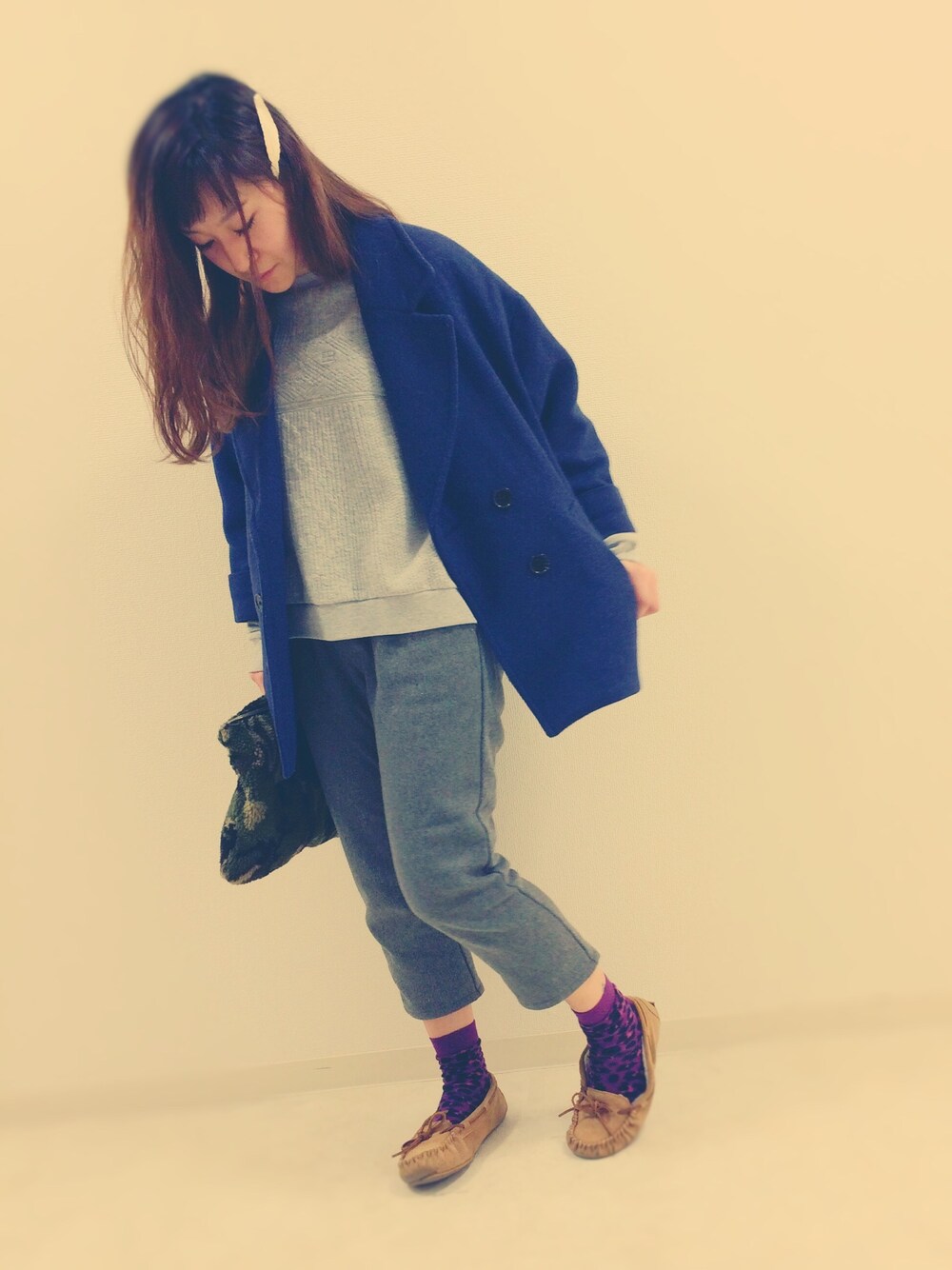 グレー×グレーに、紺チェスター。