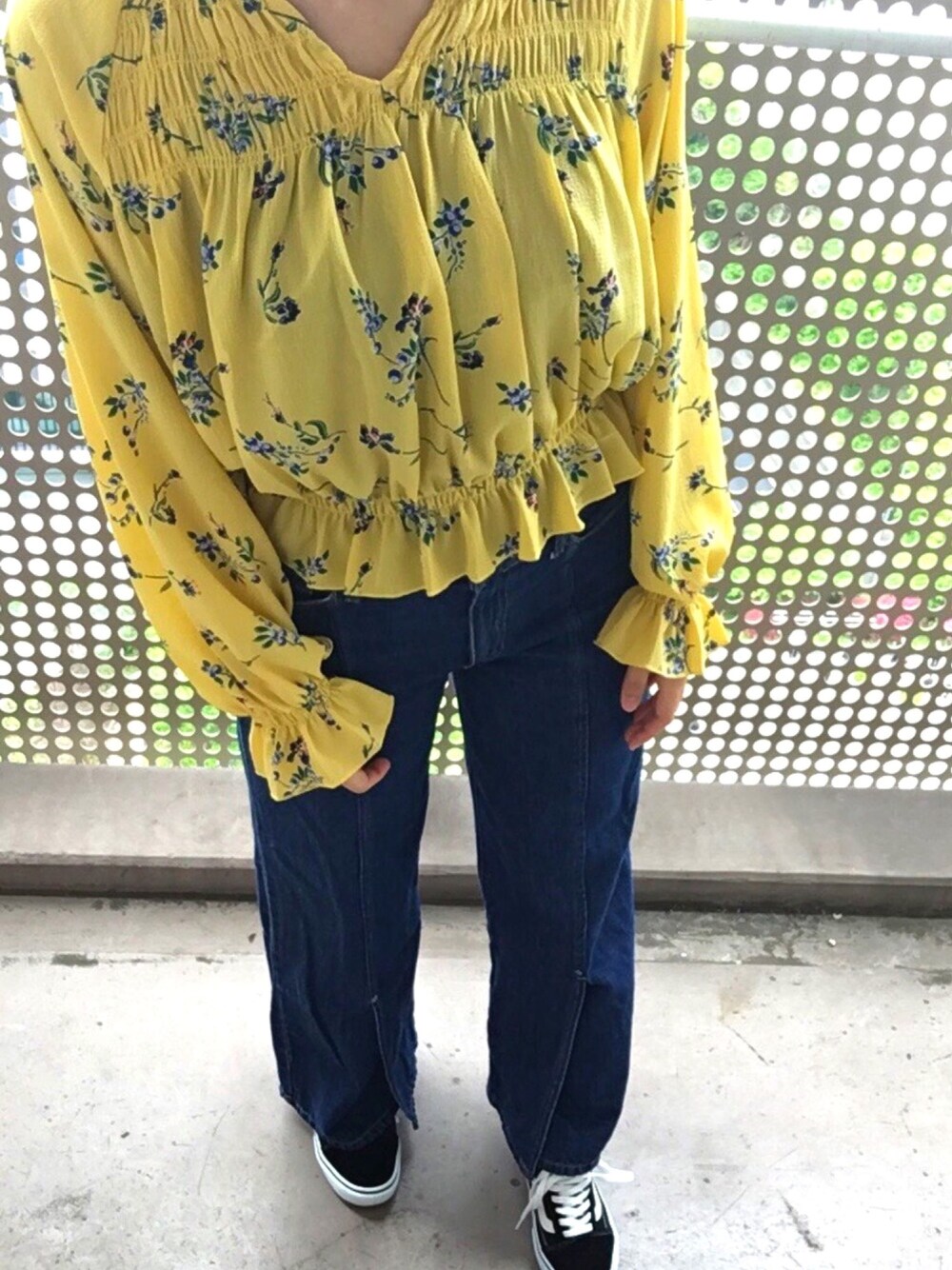 色が綺麗なブラウス🌼 デニムは下がわれてるデザインで可愛い💕 もっと綺麗にコーデ撮れるようになりたい…😂