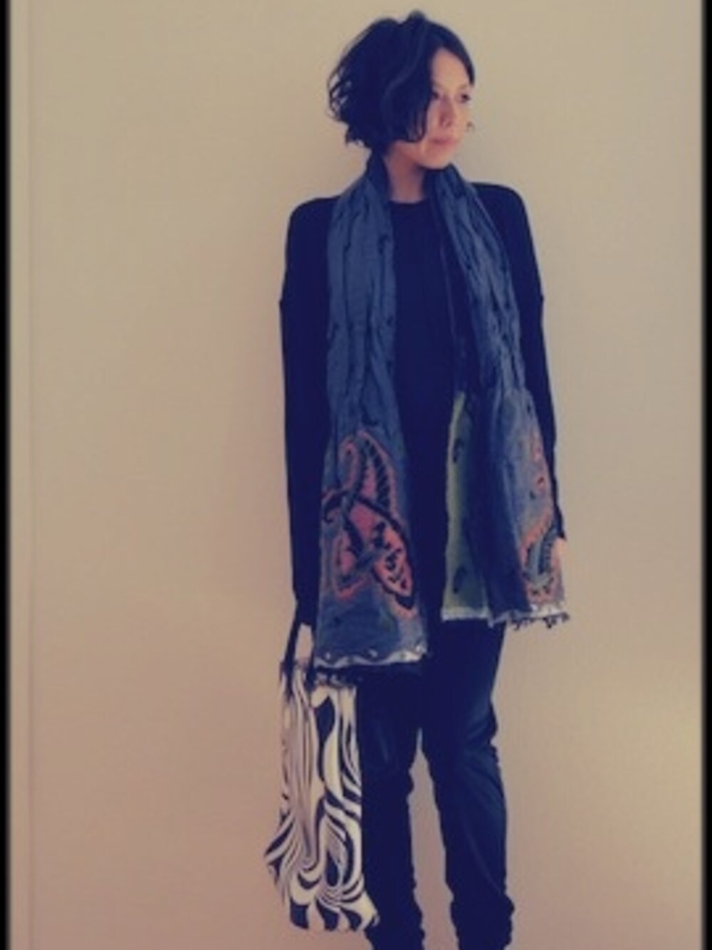 coordinate「Print Goods」 プリントものの小物を使いたくて、服はブラックでシンプルに。 シースルーのトップスと光沢のあるパンツで素材で遊んでます。