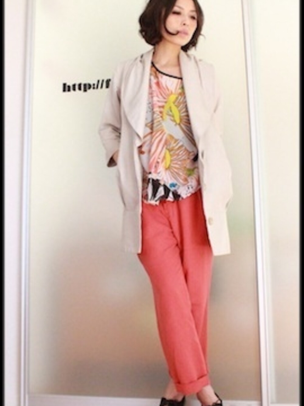 coordinate「print tops」 黒豹と椿の鮮やかなプリントブラウスとカラーパンツを合わせました☆ トレンチを羽織って。