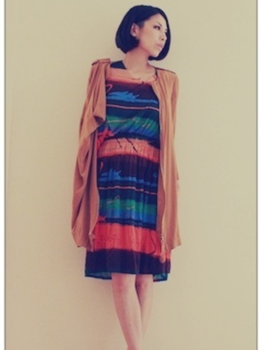 coordinate「SHARK」 サメプリントのカラフルワンピにシャリ感のあるミニワンピを羽織りに合わせました。 ワンピースはカラー使いがリゾートっぽくてかなり好きな感じ。