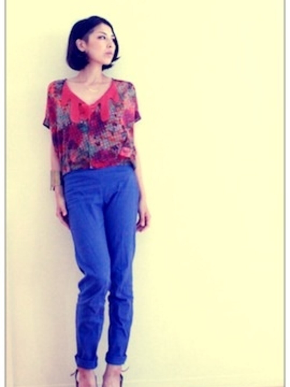 coordinate「Sunflower」 ヒマワリ柄のトップスにカラーパンツをプラス。 丈短のトップスと厚底なサンダルでスタイルUP狙ってます。