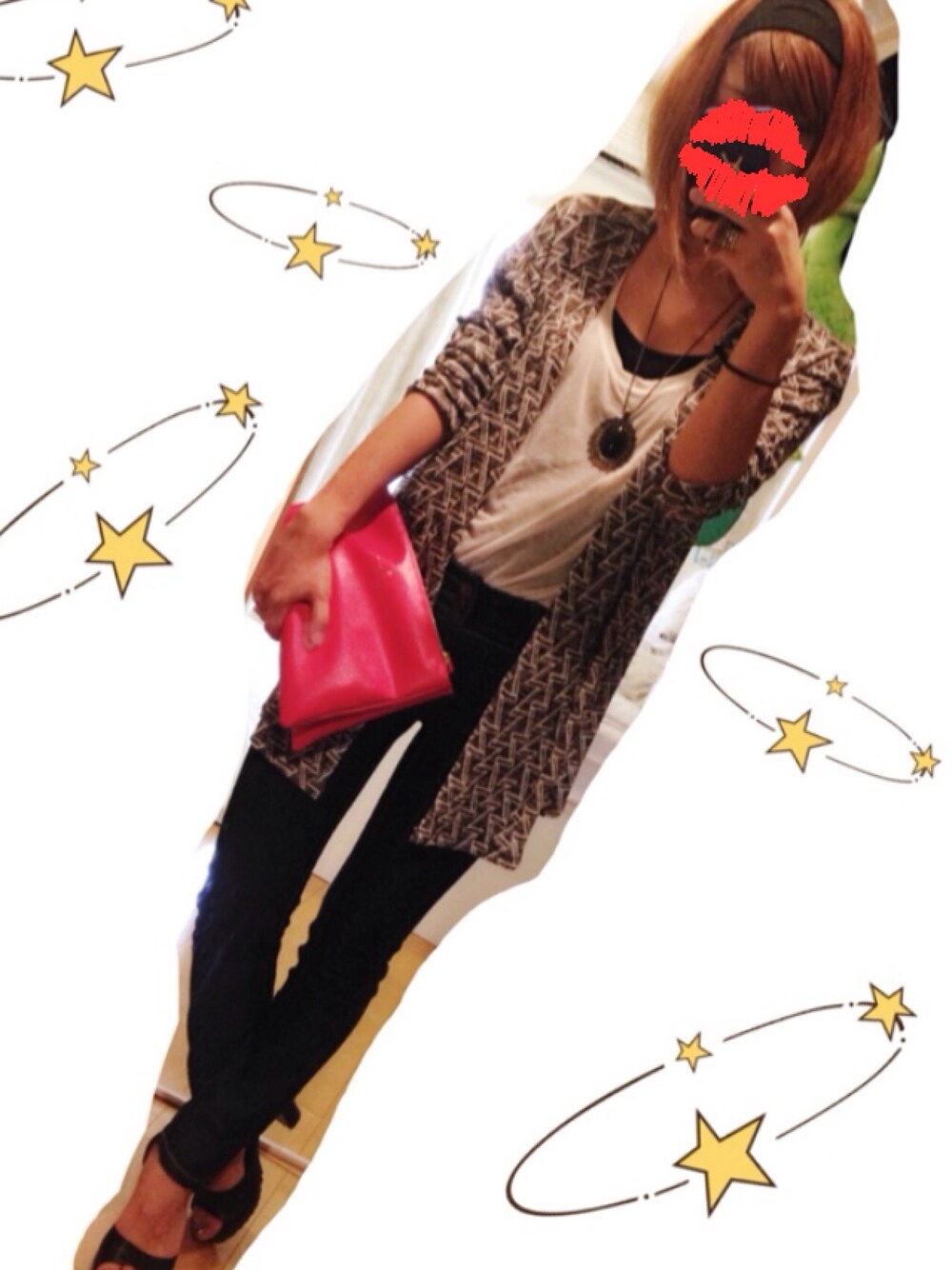 稲妻柄のサマー素材のカーディガンと ショッピングピンクのクラッチ ✝ 派手だから他はシンプルでまとめてみた !