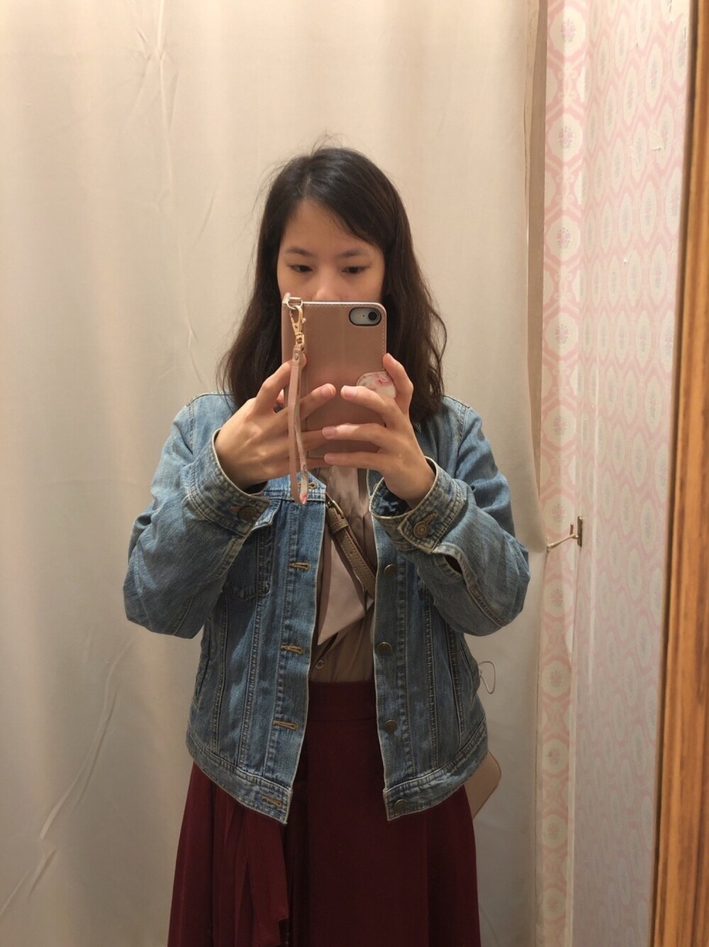 ボルドーのプリーツスカート、ボウタイブラウスのキレイめコーデをGジャンで外したコーデ! 映ってないけど、靴はホーキンスのパンプス! 五反田のTOKYOOUTLETWEEK行って、帰りに海老名で服を買ったー! earthのワンピースを試着する前に撮ったー!