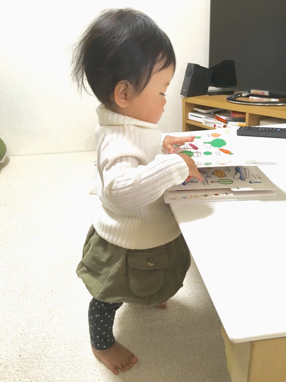 洋服も成長記録として残していきたいなと はじめて登録してみます。 11ヶ月やっと70㎝の服がピッタリになってきました。 テーブルにつかまり立ちはできるけれど、 一人で歩くのはまだまだ先?かな 最近は絵本を指差すようになりました。 野菜が好きな様子。