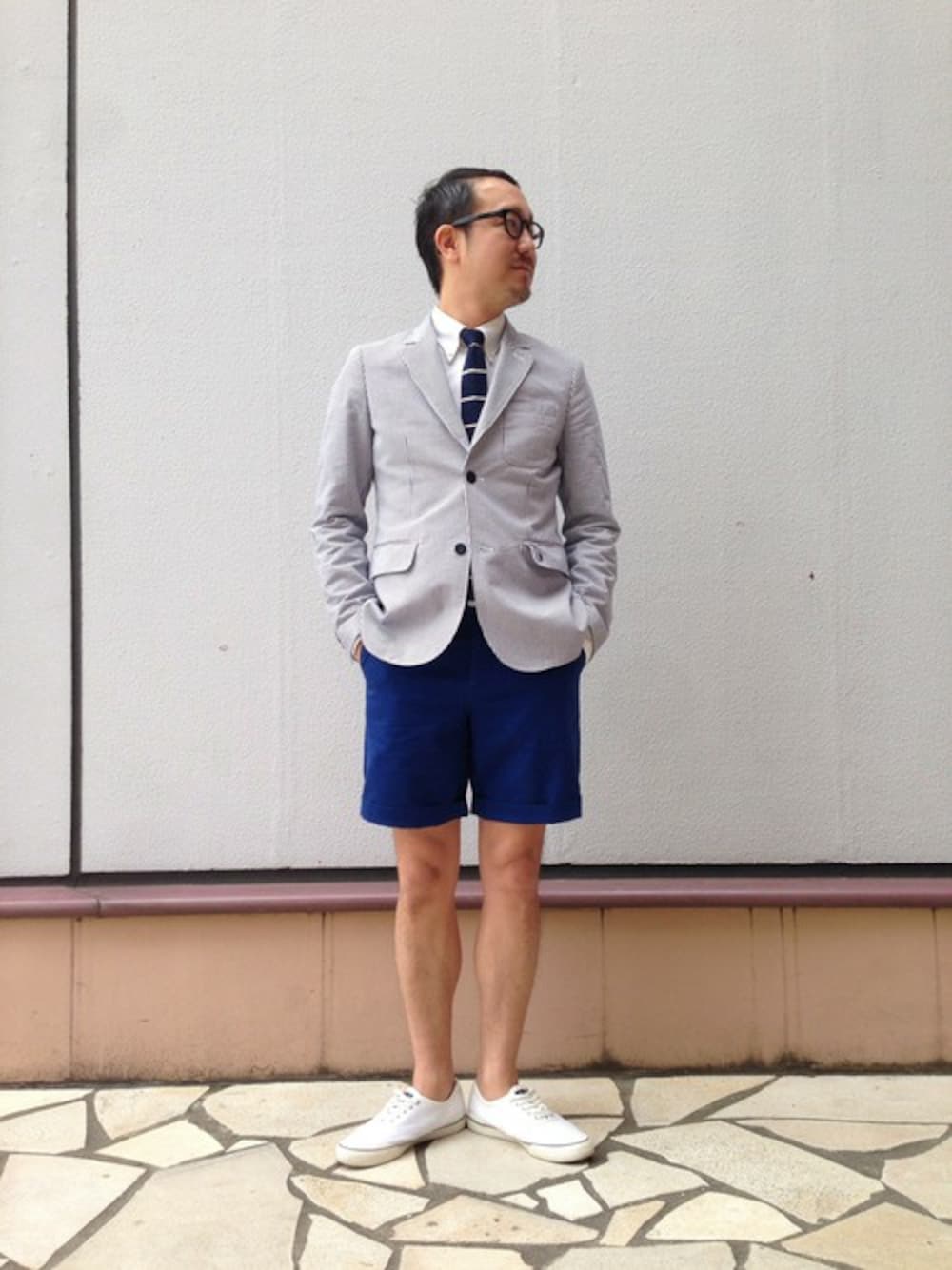 ジャケット&ショーツにスペリーソールのデッキシューズを合わせたマリンスタイル