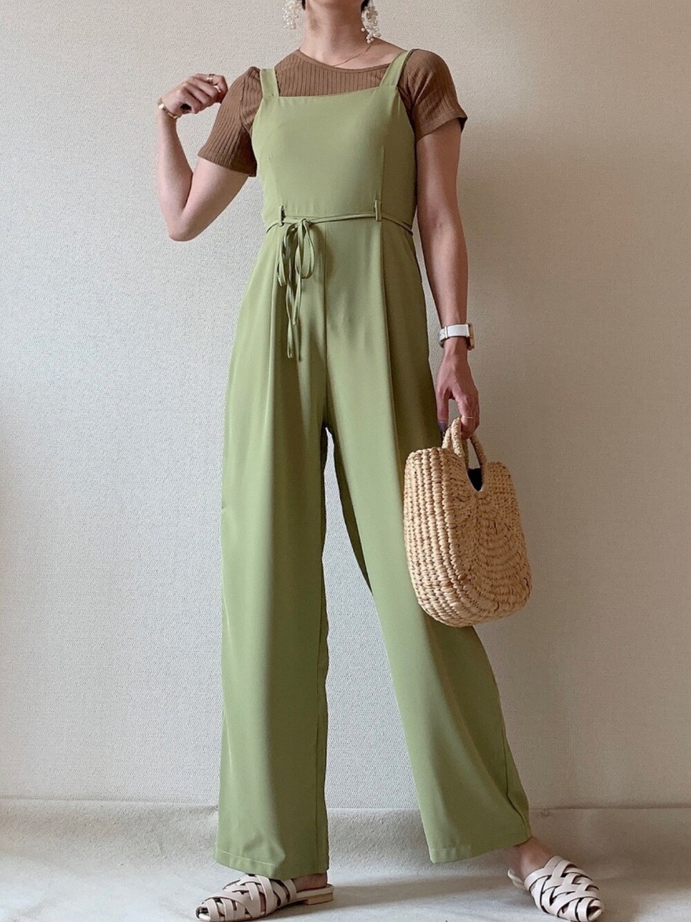 脚長効果抜群のサロペットは @chicwish ピスタチオグリーンにしたよ💡 くすみカラーだからイロモノでも 大人っぽく着れます🙌🏻