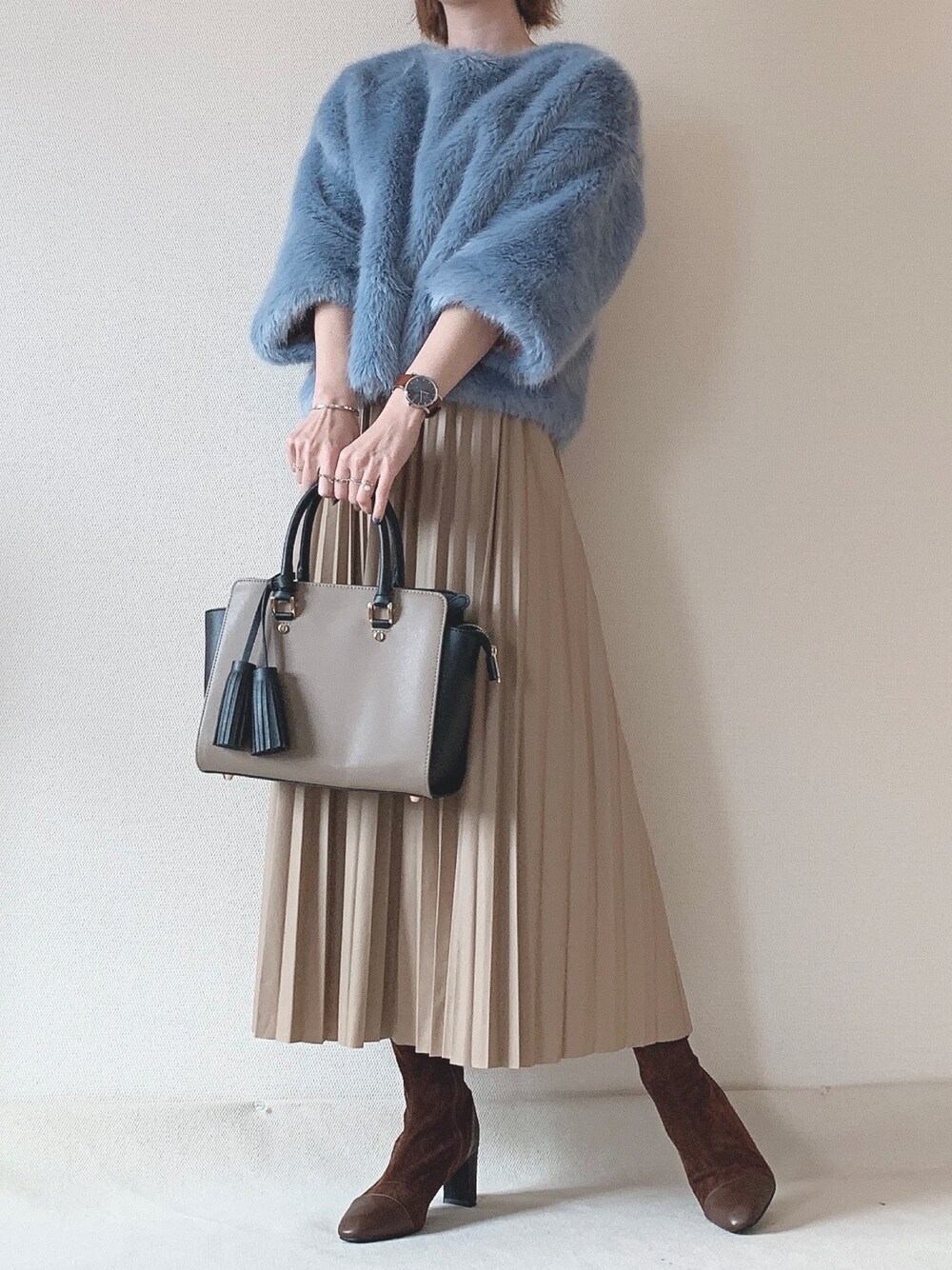 プリーツレザースカートは 柔らかい感じが出るベージュ もこもこのファートップスで 異素材MIX♡