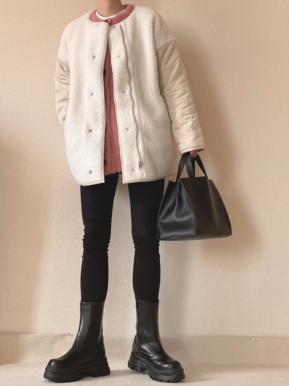 0810.asのノーカラージャケット「ボア×キルティングリバーシブルコート」を使ったコーディネート