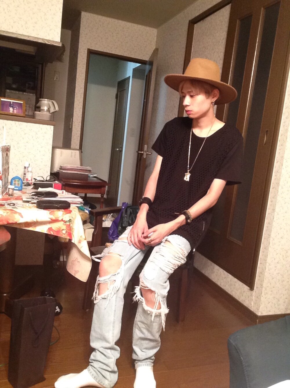 ブラック系のTシャツ/カットソー、ブルー系のその他パンツを着用したメンズの夏コーディネートの1枚目の写真