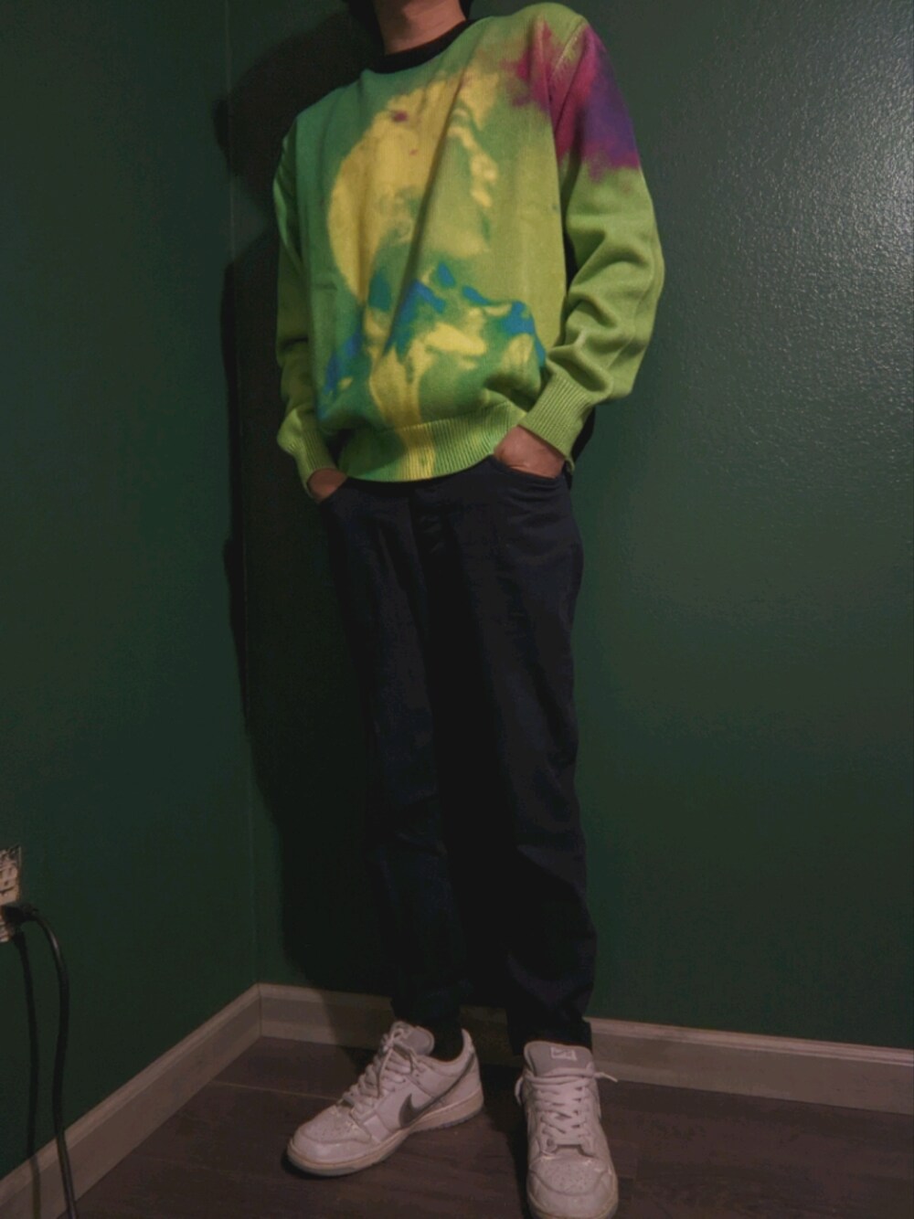スニーカー:[古すぎ]3m リフレクター2005 NIKE SB Dunk ベイブキューブシティMedicom 3 下の写真は買ったばかり 今はもう崩れてしまう セーター:Dries Van Noten Len Lye