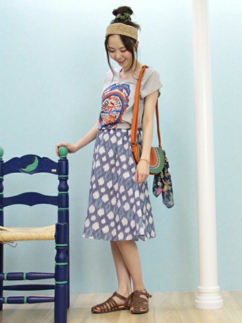 ビンテージ感を味わうスカートスタイル。 さりげなくエスニックな雰囲気をプラスさせ、リゾートな表情に♪