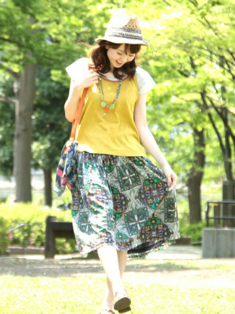 存在感のある表情のひざ丈スカート。 エスニックな雰囲気のカラーでまとめました◎