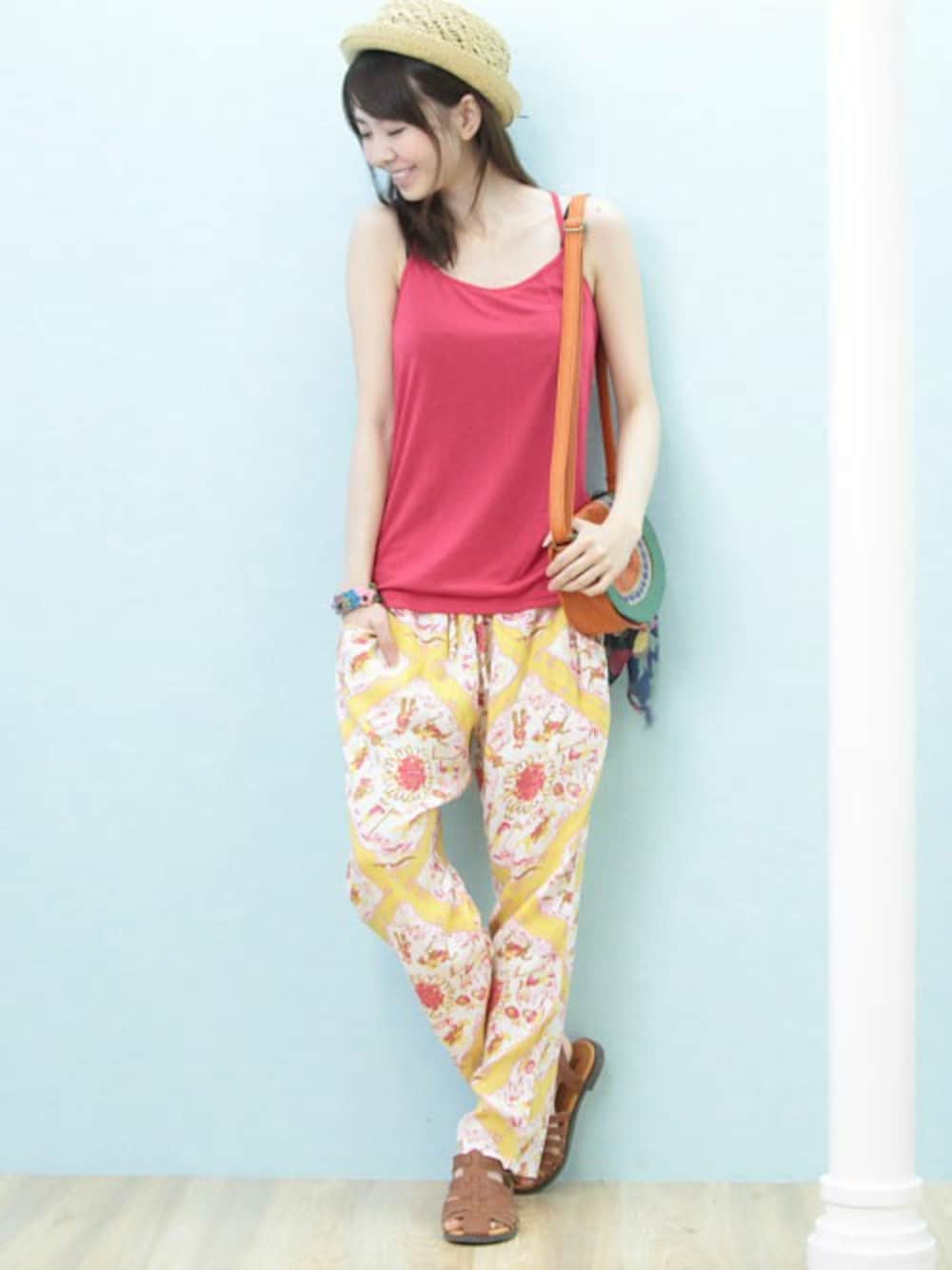 ピンクとイエローの配色が夏らしい! リラックスムードたっぷりのコーディネート。