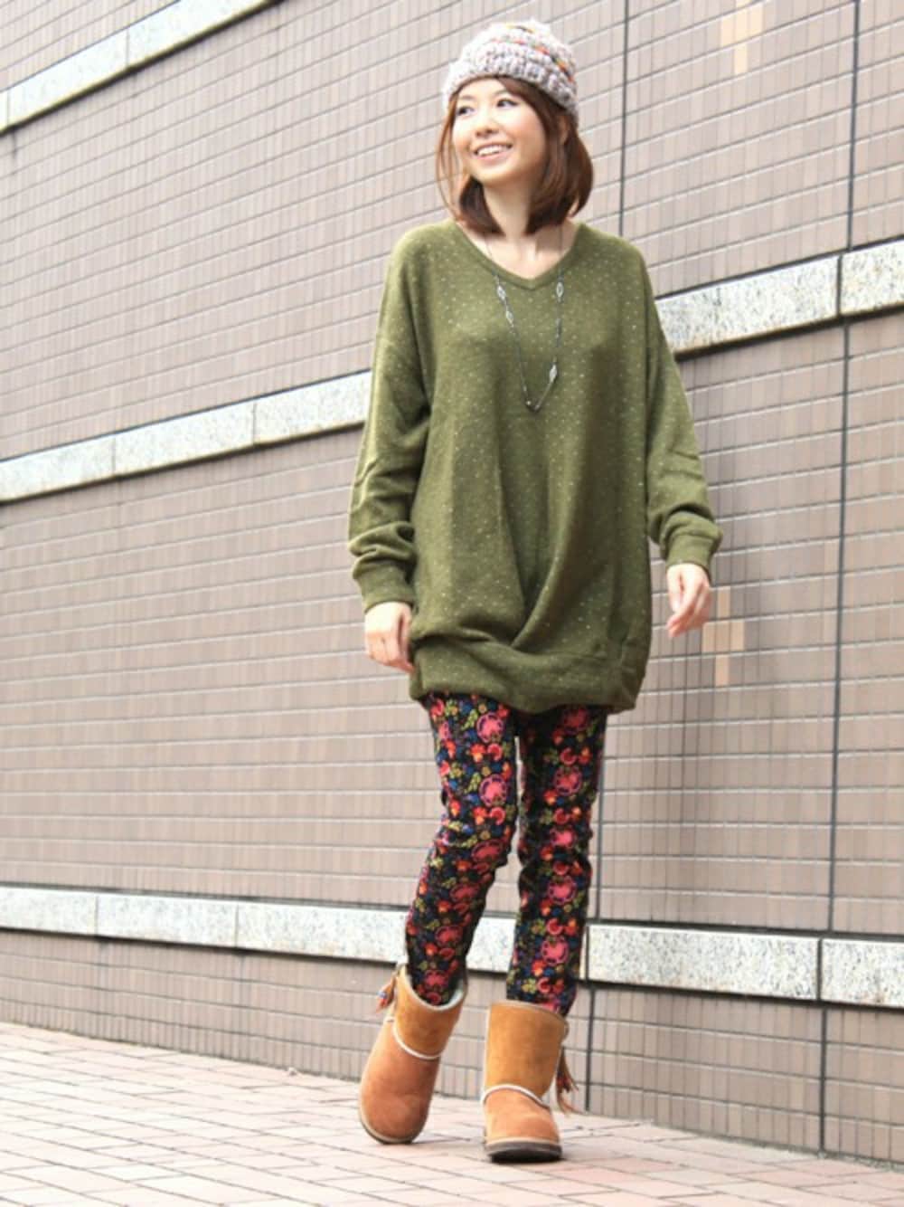 トレンドのモヘア素材のワンピースを柄パンツに合わせて。 シンプルな組み合わせの中にも民族調の色合いのアイテムを組み合わせ、 簡単にエスニックな雰囲気を楽しめるスタイリングにしました。 ドット柄のようなキラリと光るラメも女性らしいポイントです。