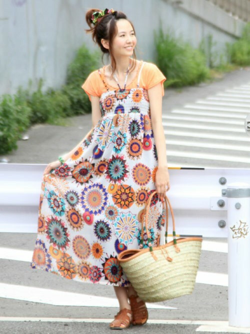 シフォン生地にビビットなトルキッシュ柄のワンピースにはシンプルなサンダルとシュシュで◎