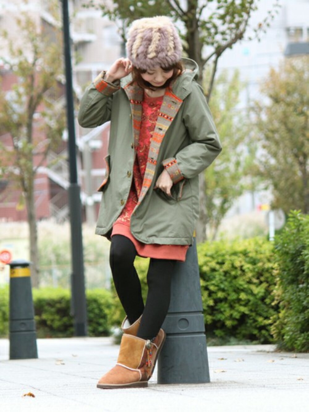 裏地からチラリとエスニック柄がのぞくモッズコートにワンピースを合わせました。 同じ丈のアイテムを合わせることで全身をすっきりした印象に。 ピンク×カーキのコントラストも可愛さの中にカジュアルな雰囲気を感じさせます。