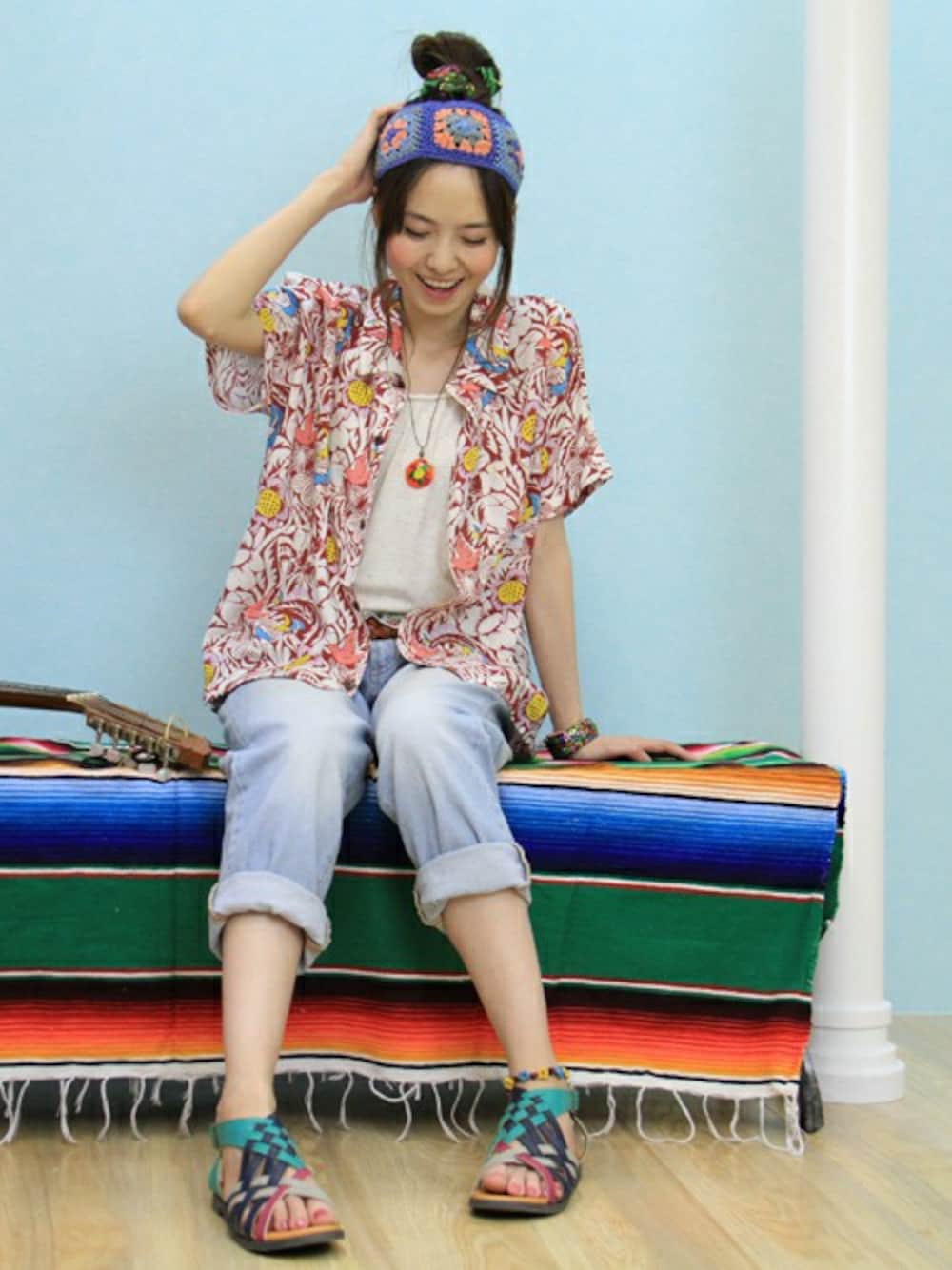 リゾートな雰囲気たっぷりの柄シャツをデニムに合わせて。 お団子ヘアーで女の子らしい可愛い表情に♪ 小物はカラフルなモノを選んで遊びゴコロをプラス!