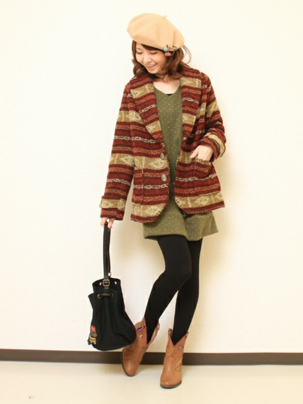 デートに来ていきたいクリスマスを意識したコーディネート。 少し大き目のアウターをワンピースにあわせて女性らしい雰囲気に仕上げました。 落ち着いた冬カラーでまとめ、上品な風合いに。