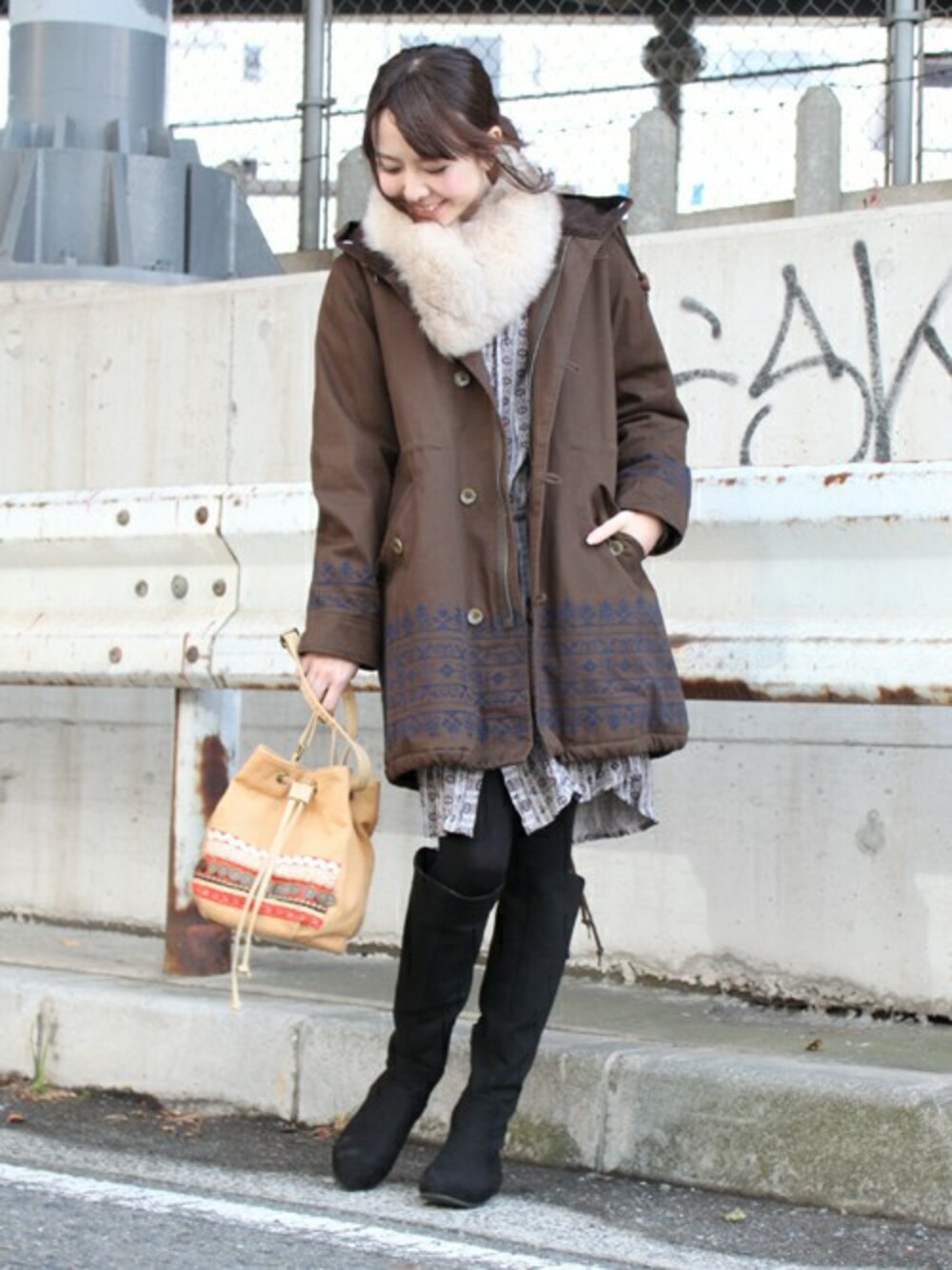 ファーのスヌードをアクセントにした冬コーデ。 バッグでさりげなくエスニック感を出し、コートの下からもレトロな雰囲気の花柄が大人上品な表情に。
