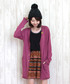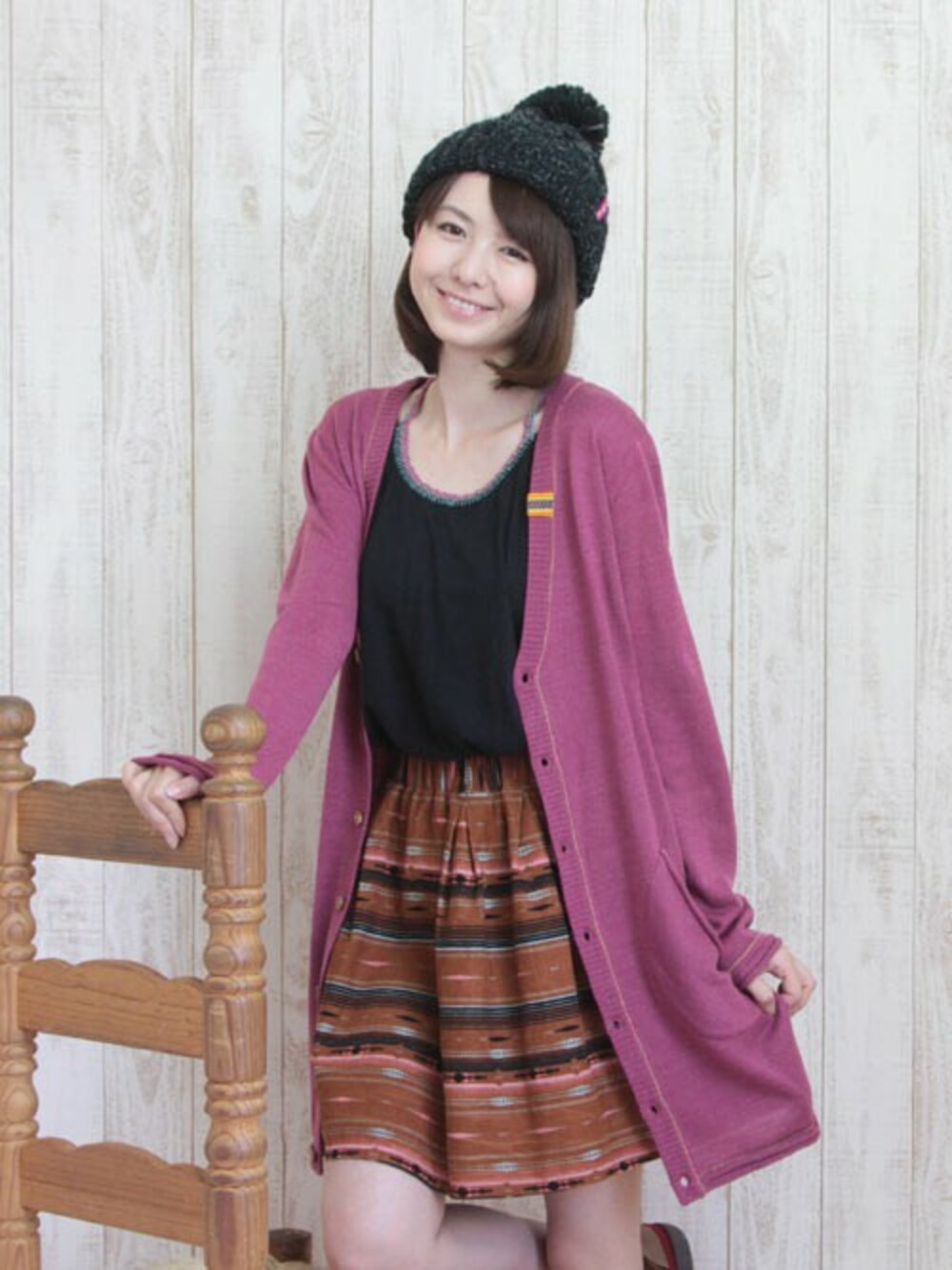 カラフルなペルーテープがポイントの、秋色ロングカーディガンにニットキャップを合わせて秋らしく◎