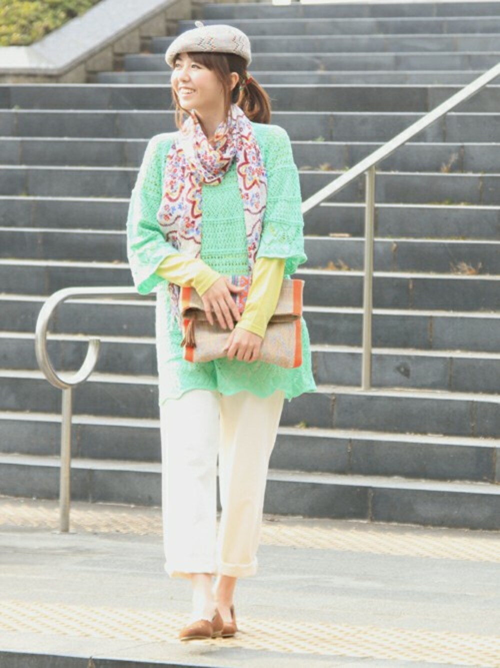 早くも春を感じさせる明るいパステルカラーのスタイリング。 柔らかなざっくりニットのワンピースに今季トレンドの”ホワイト”のパンツを合わせて。 アクセントにくるりと巻いたスカーフが華やかさをプラスさせます。