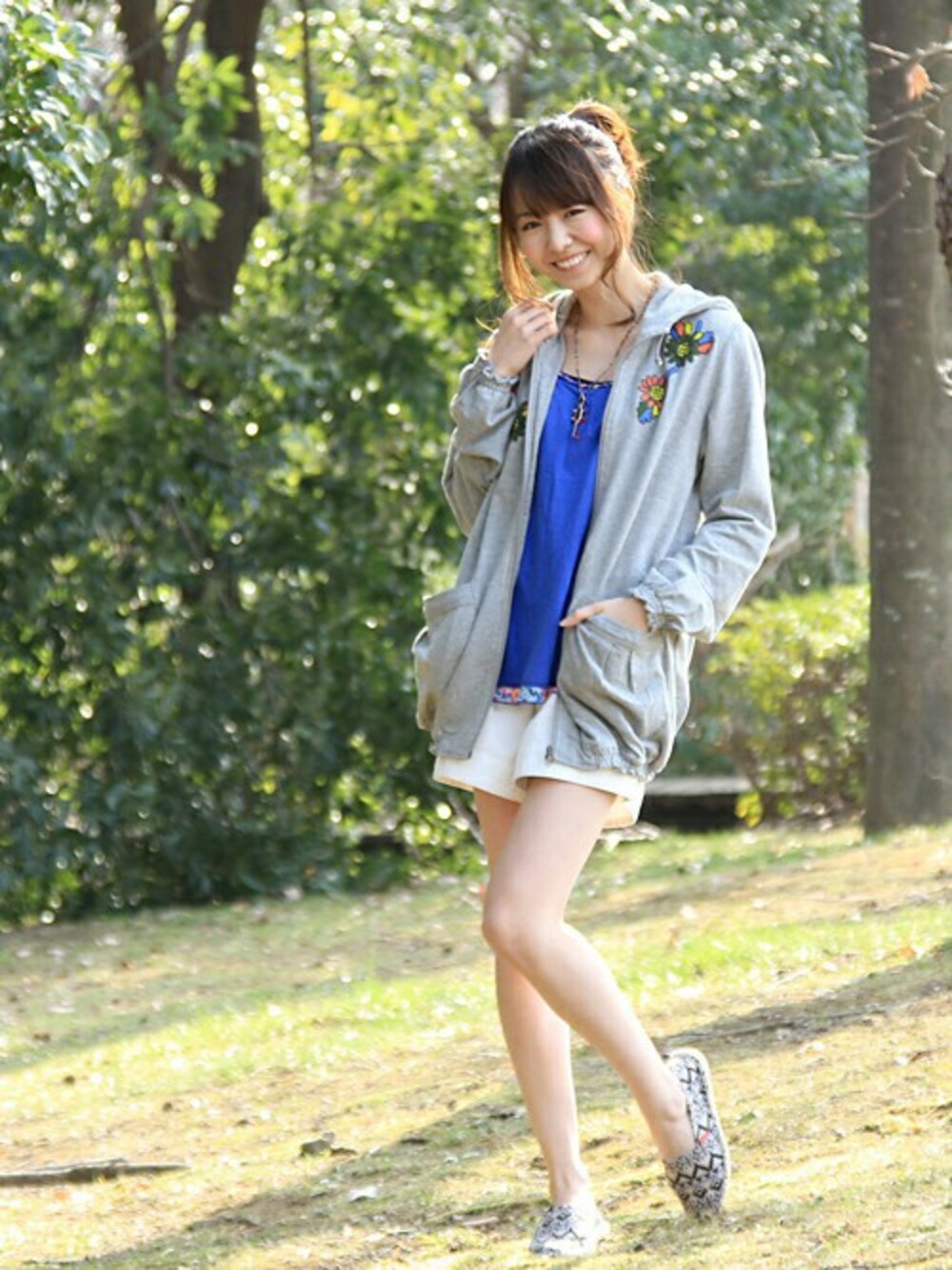 パロッツがかわいらしいパーカーとビビットなプルオーバーを合わせて軽やかに。