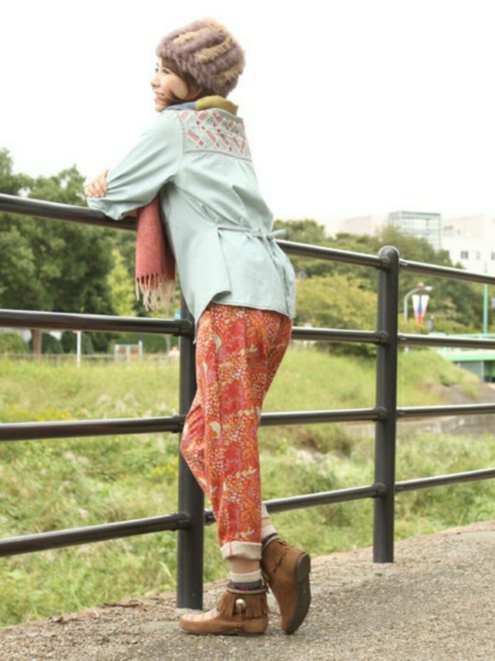 ガーリーなデニムブラウスにゆるめの柄パンツを合わせました。 ストールやファー素材の帽子を合わせて女の子らしいコーディネートに♪ ブラウスの背中のカラフルな刺繍にも注目です☆