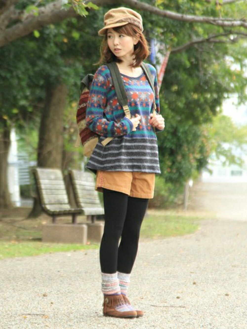 秋の山ガールを感じさせるカジュアルなコーディネート。 ボーダー柄がアクセントになったトップスをメインに、ブラウン系のアイテムでまとめた ほっこりあたたかみを感じられるスタイリングに仕上げました。