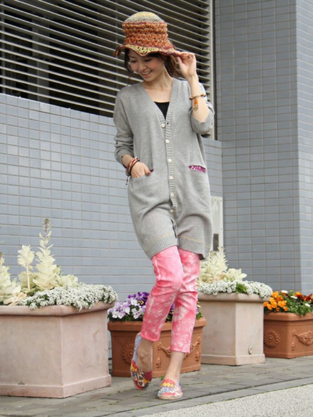 ダイダイ柄のレギパンにロングカーディガンを合わせたシンプルコーデ◎