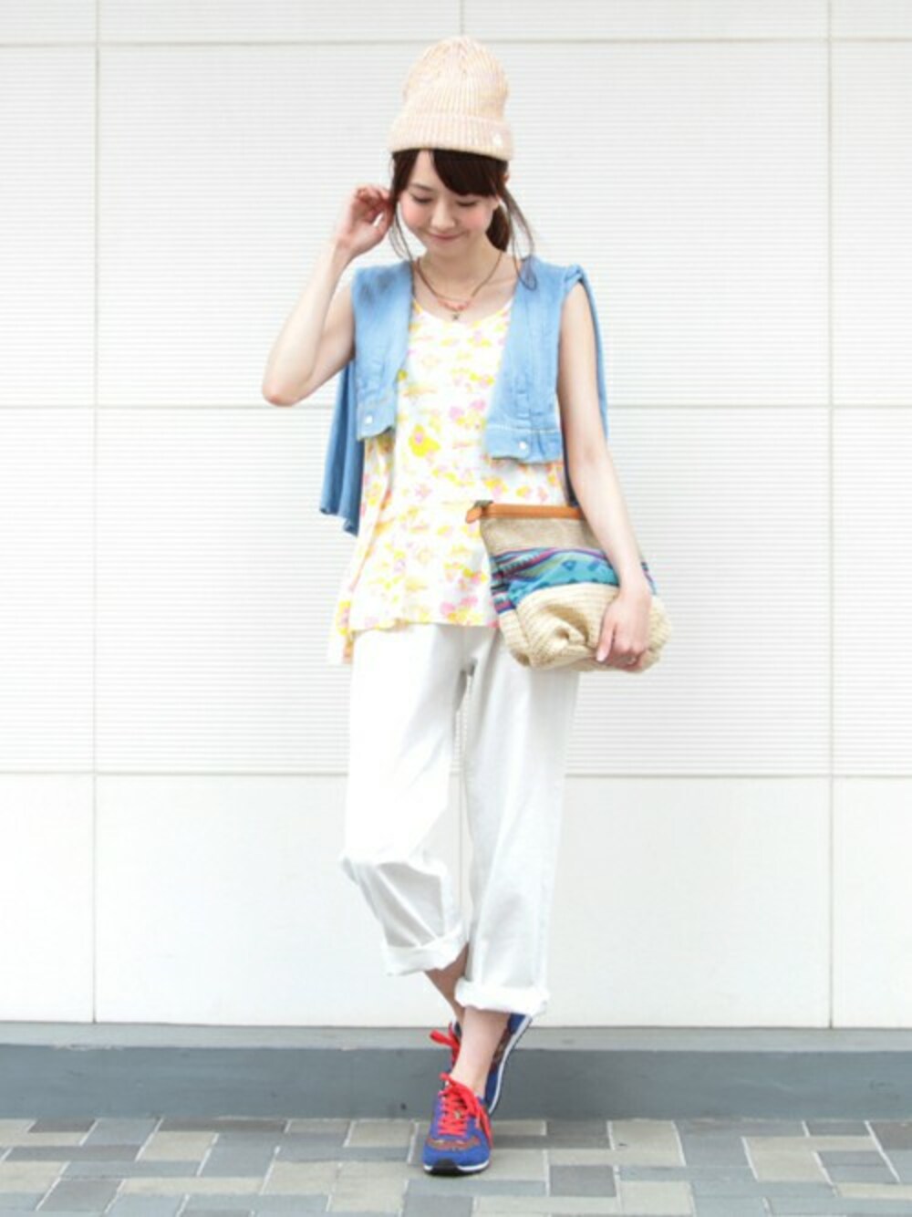 ゆったりワイドなホワイトのパンツを夏を感じさせるレトロな柄のトップスに合わせて。 足元はスニーカーでカジュアルな雰囲気でトレンド感をおさえて☆