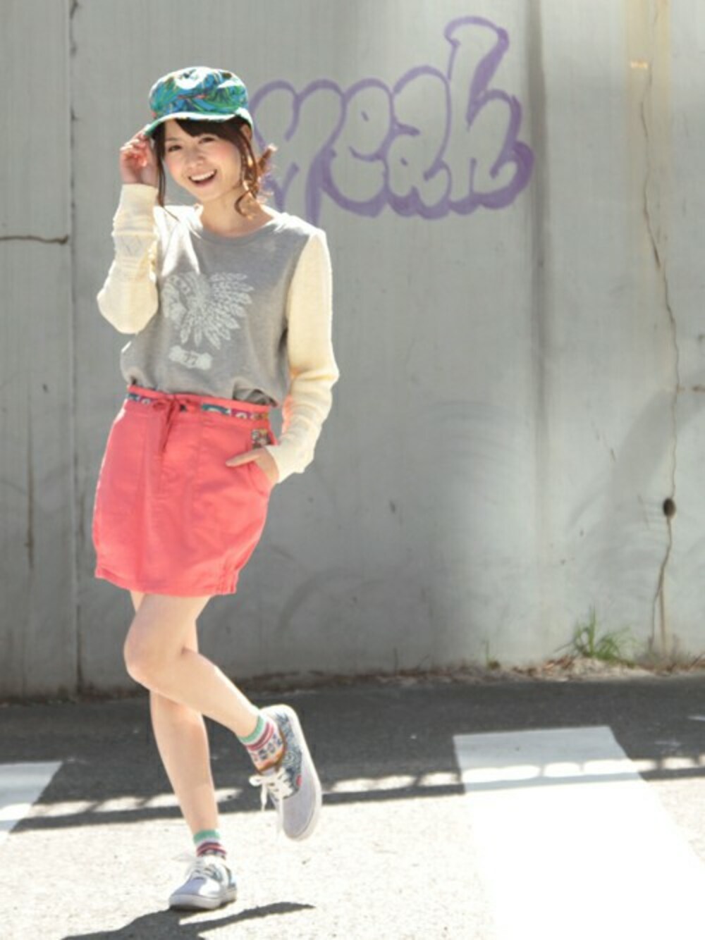 トレンドのスウェットをスカートにインをしたスタイル。 全体的にストリート風にまとめ、トロピカル柄のキャップをアクセントにしました◎ 足元は靴下×スニーカーでカジュアルに。