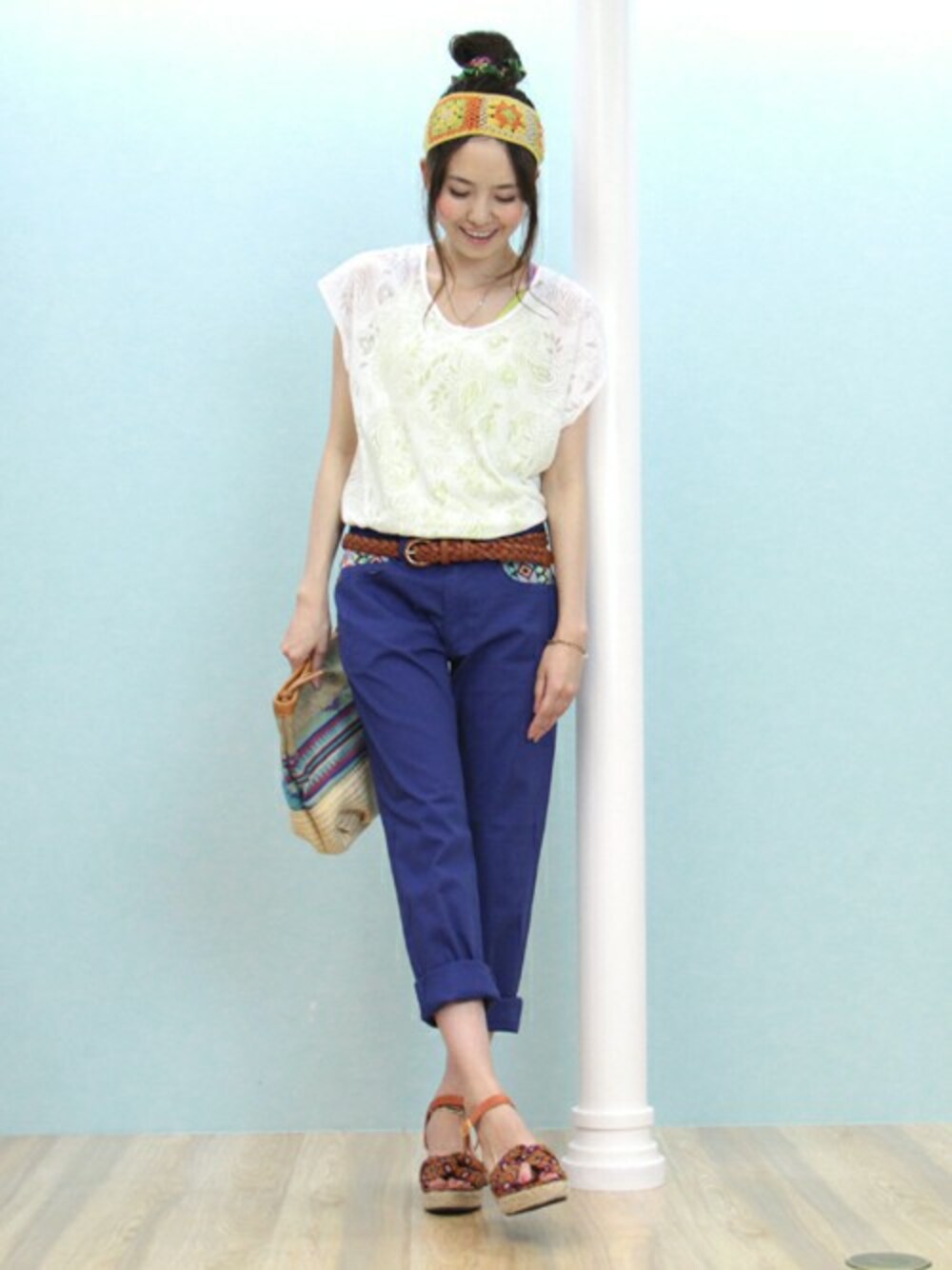 トレンドであるブルーのパンツをホワイトのトップスに合わせて。 夏らしいカラーコントラストとシルエットで涼しげな表情に♪