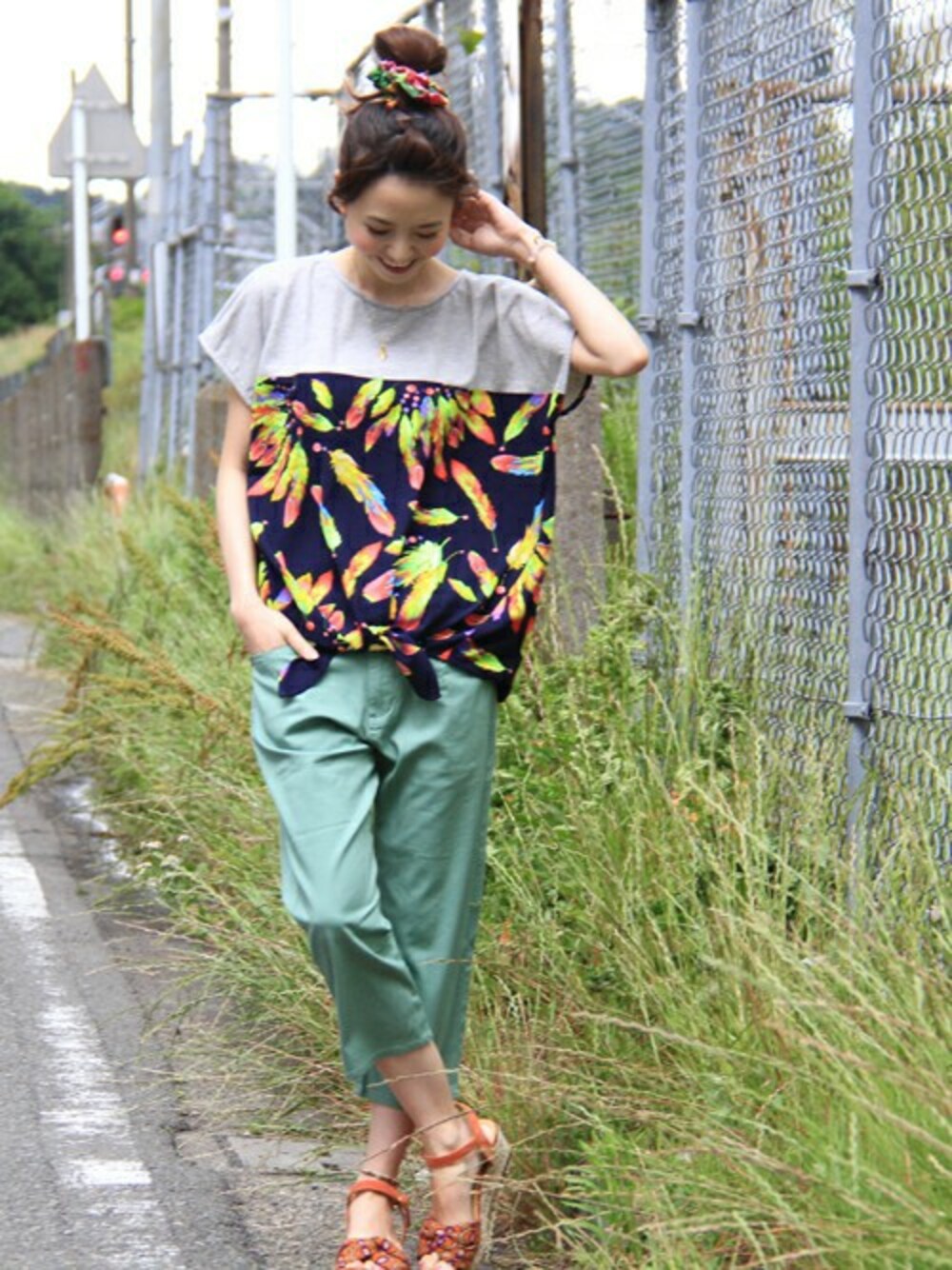 存在感のあるフェザープリントのTシャツをクロップドパンツに合わせて。 ゆるくラフな表情にヒールのサンダルを合わせれば女性らしい雰囲気に♪