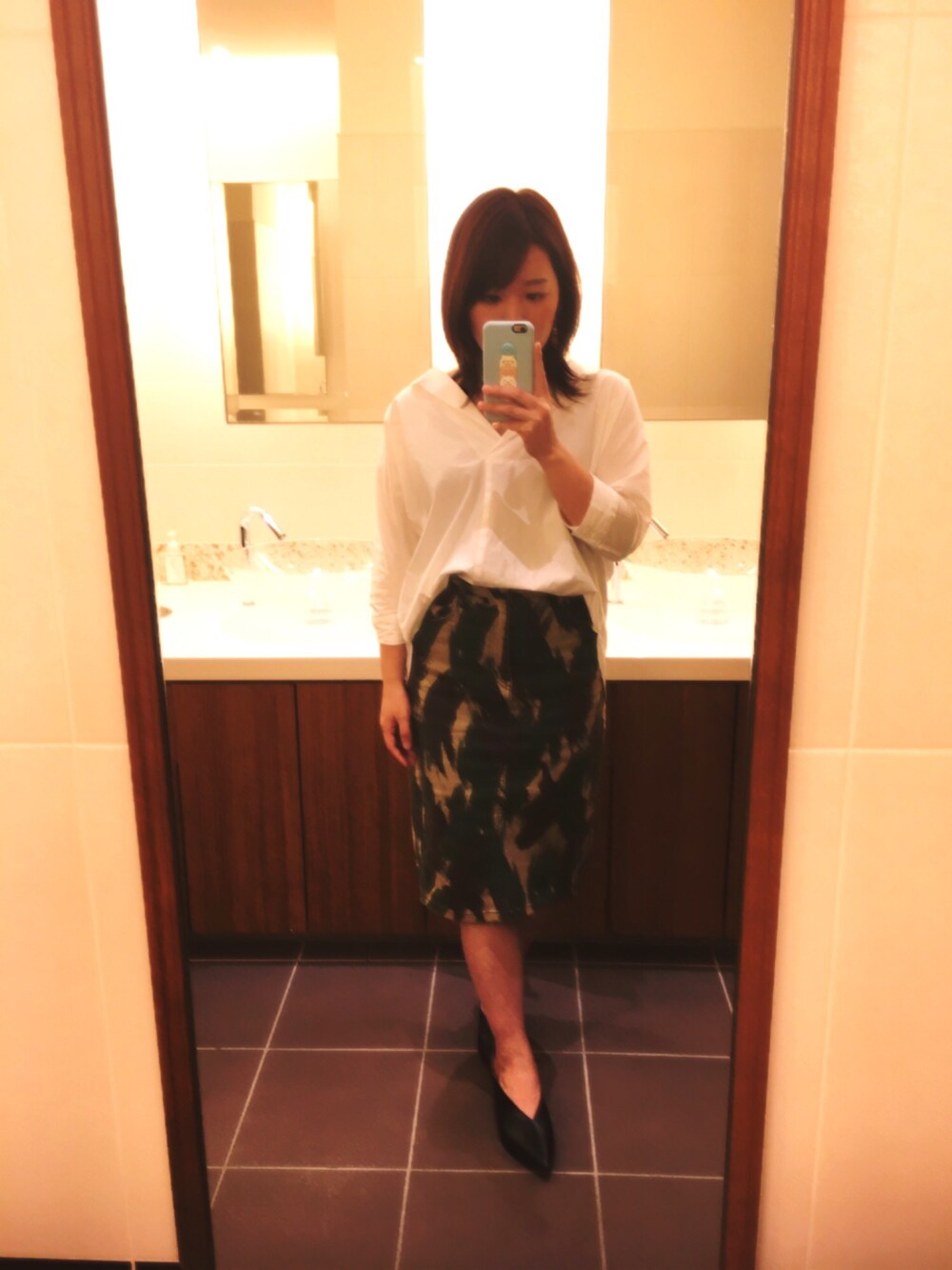 グリーン系のスカート、ホワイト系のシャツ/ブラウス、ブラック系のシューズを着用したレディースの春コーディネートの1枚目の写真