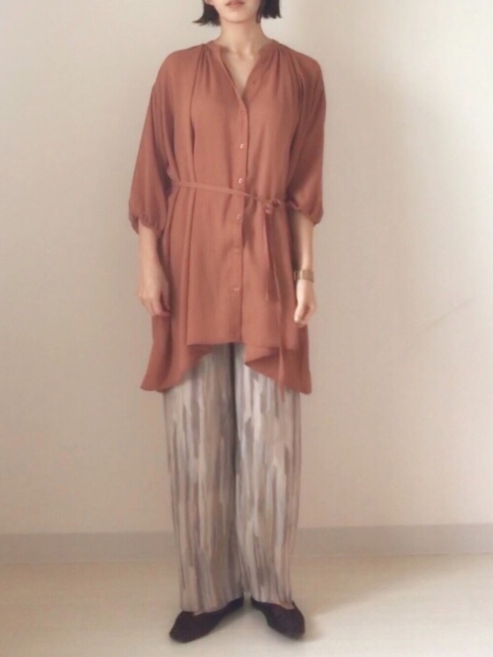 楊柳ブラウス🍐 × プリントプリーツパンツ🍐 +イヤーカフ ┈┈┈┈┈┈┈┈┈┈┈┈┈┈┈┈┈┈ いつもいいね♡フォロー ありがとうございます! 初秋アイテム🍐コーディネート 見た目から秋らしく カラーとプリントを選びました 楊柳ブラウスはシャリ感があり7分袖☝🏻 すっきり華奢見え🙌🏻 着丈が長めで羽織りとしても〇 秋アイテム第1弾!季節の変わり目にオススメです レイヤードも楽しそうなデザインです プリーツパンツは 穿くだけでサマになります✨ プリントは強すぎないので 程よくコーディネートのアクセントに〇 秋を感じる優しいカラーのカモフラージュです🌳🍂🍁 ┈┈┈┈┈┈┈┈┈┈┈┈┈┈┈┈┈┈ モネと菅波先生に毎日癒されています☺️ 私もサメ展に行きたいです…🦈