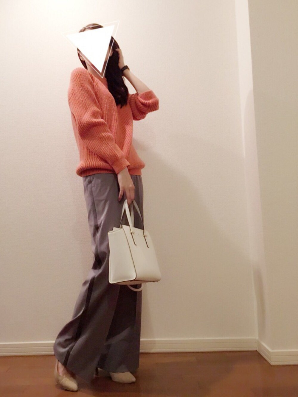 〜衣替え編〜 大好きなコーラルピンクのニット! ちょっとキレイめに着たいときは、 グレーのワイドパンツに✨ ヒール履いて、かばんも大人めにしたら 印象変えられる✌🏻️♡