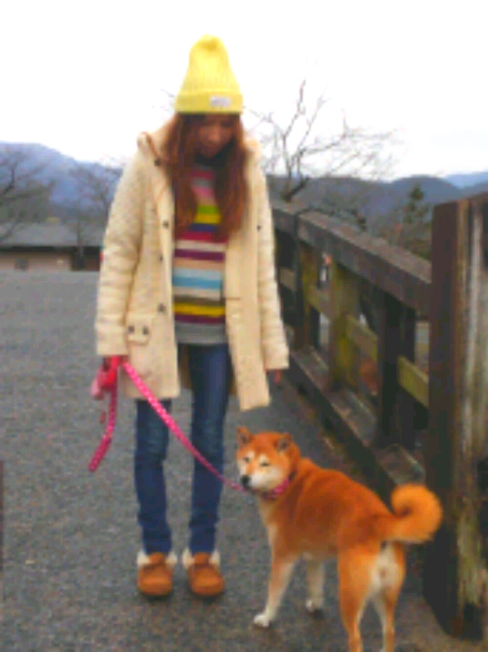 京都嵐山へ愛犬とお散歩コーデ☝ 一目惚れ😌🌸💕で即購入したカラフルニット、めちゃめちゃ可愛い❤ 私のテッパンスキニー❗