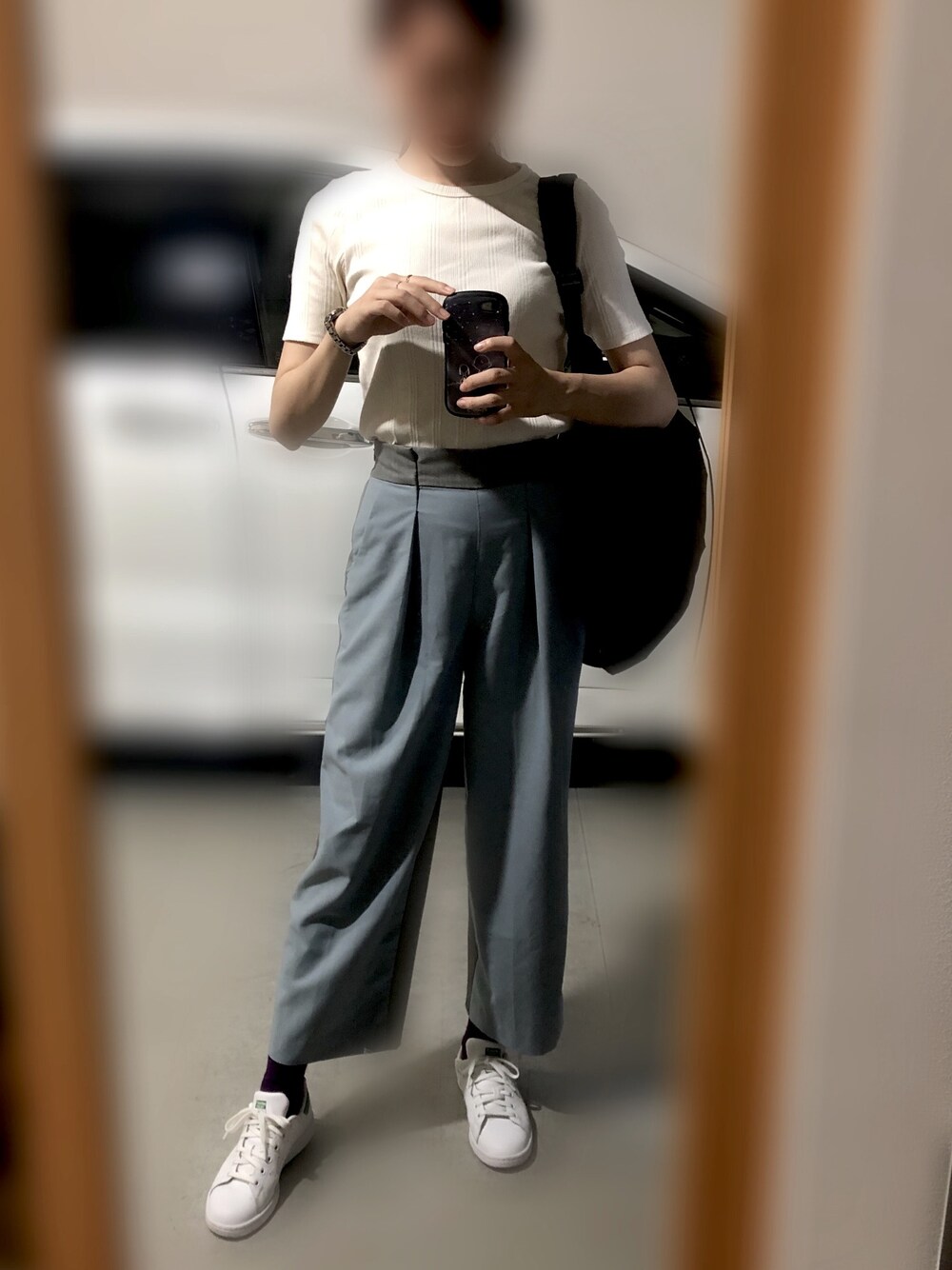 いつかの出勤コーデです! このパンツは前がグレーで、後ろが水色になっていて、前も後ろで違う姿を見せられます!笑