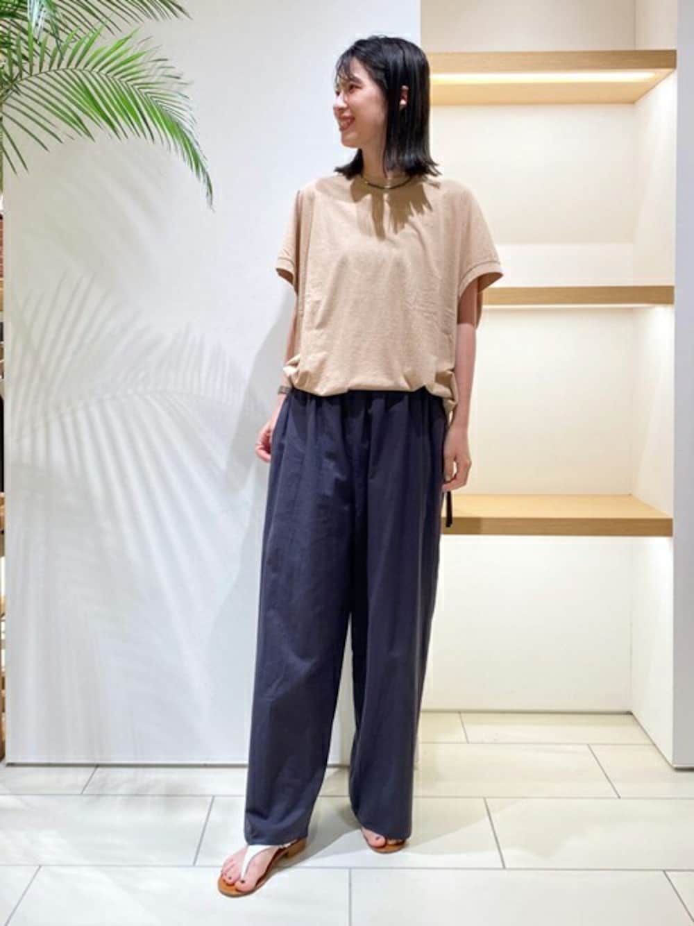 トップスは、ゆったりとしたシルエットにドロップショルダーで抜け感たっぷりのバランスです。 ボトムは、インドコットンを使用した柔らかく通気性の良い素材なので夏のスタイリングにおすすめです。