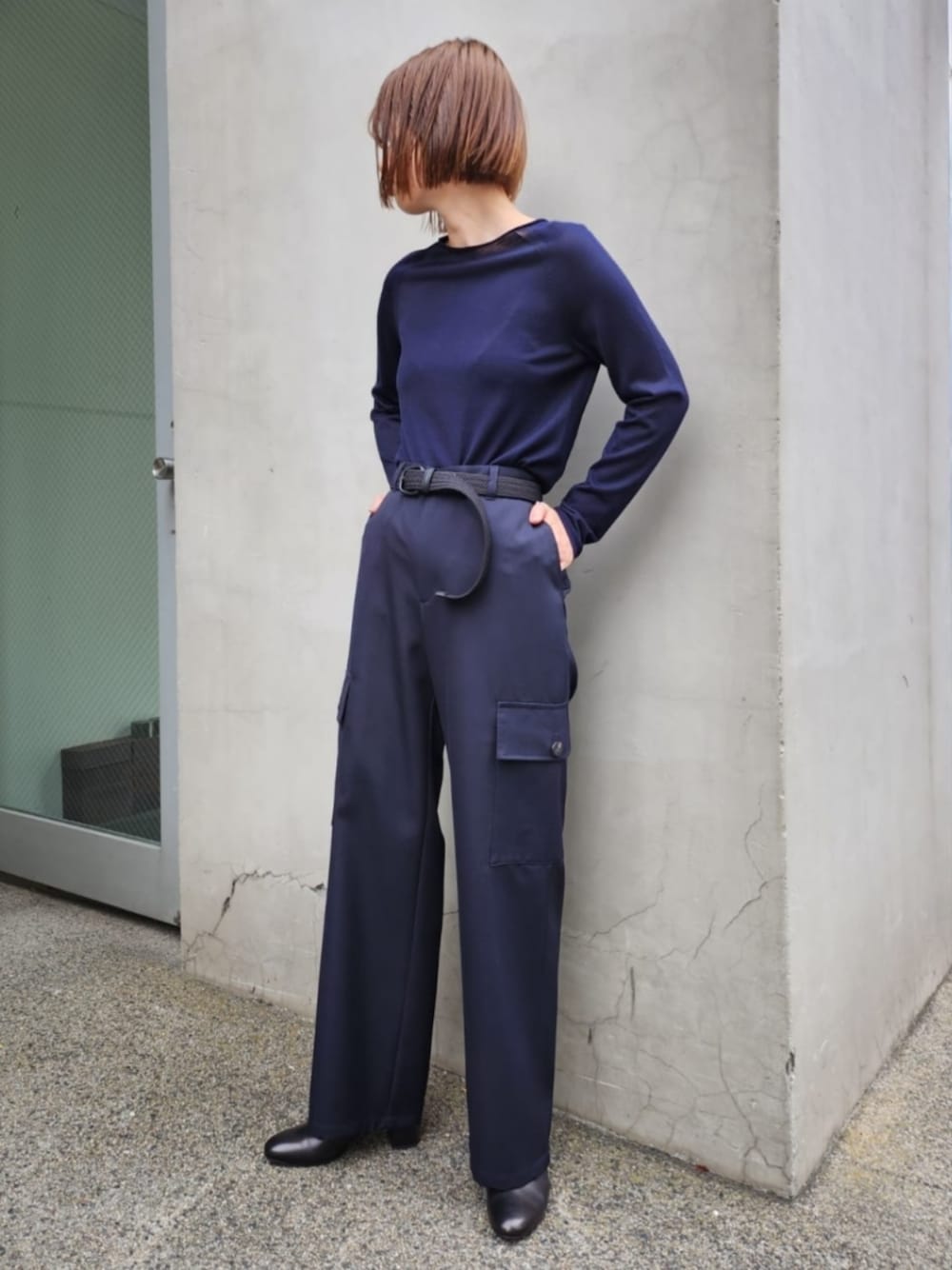 ネイビーのワントーンコーディネート。 小物はブラックで統一して、クールな印象に。 パンツは、カーゴデティールですが薄手のウールギャバジンを使用したハリのある素材なのでクリーンで上品にお召しいただけます。
