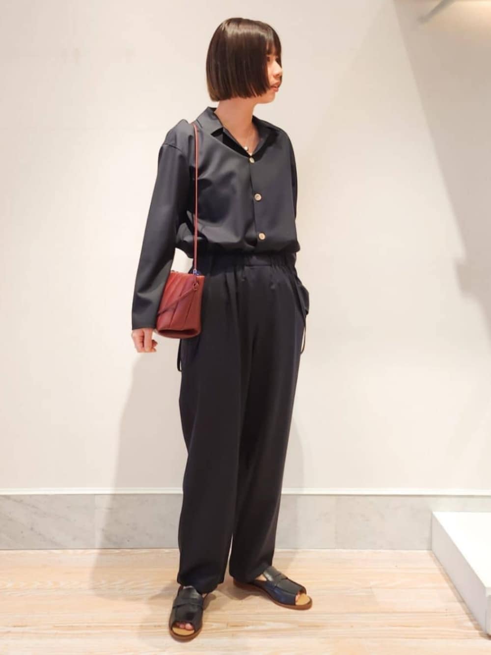 同素材のブラウスとパンツをセットアップで着用しました。 滑らかで少し光沢感も感じられる素材は、エレガントな雰囲気でお召しいただけ様々なシーンでお召しいただけます。
